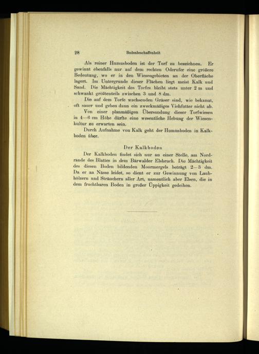 •Als reiner Humusboden ist der Torf zu bezeichnen. Er gewinnt ebenfalls nur auf dem rechten Oderufer eine größere Bedeutung, wo er in den Wiesengobieten an der Oberfläche lagert. Im Untergründe dieser Flächen liegt meist Kalk und Sand. Die Mächtigkeit dos Torfes bleibt stets unter 2 m und schwankt größtenteils zwischen 3 und 8 dm.