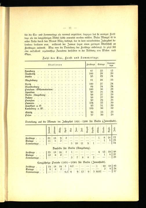 für die Lis- und Sommertage als normal anzusehen; dagegen hat sie weniger Frost- tage als im langjährigen Mittel hätte erwartet werden müssen. Dieser Mangel ist in erster Reihe durch den Monat März bedingt, der in dem verarbeiteten Jahrzehnt besonders frostarm war, während der Januar sogar einen geringen Überschuß an Frosttagen aufweist. Mas nun die Verteilung der Frosttage anbelangt, so zeigt sich eine auffallend regelmäßige Zunahme derselben in der Richtung von Westen nach Gften.