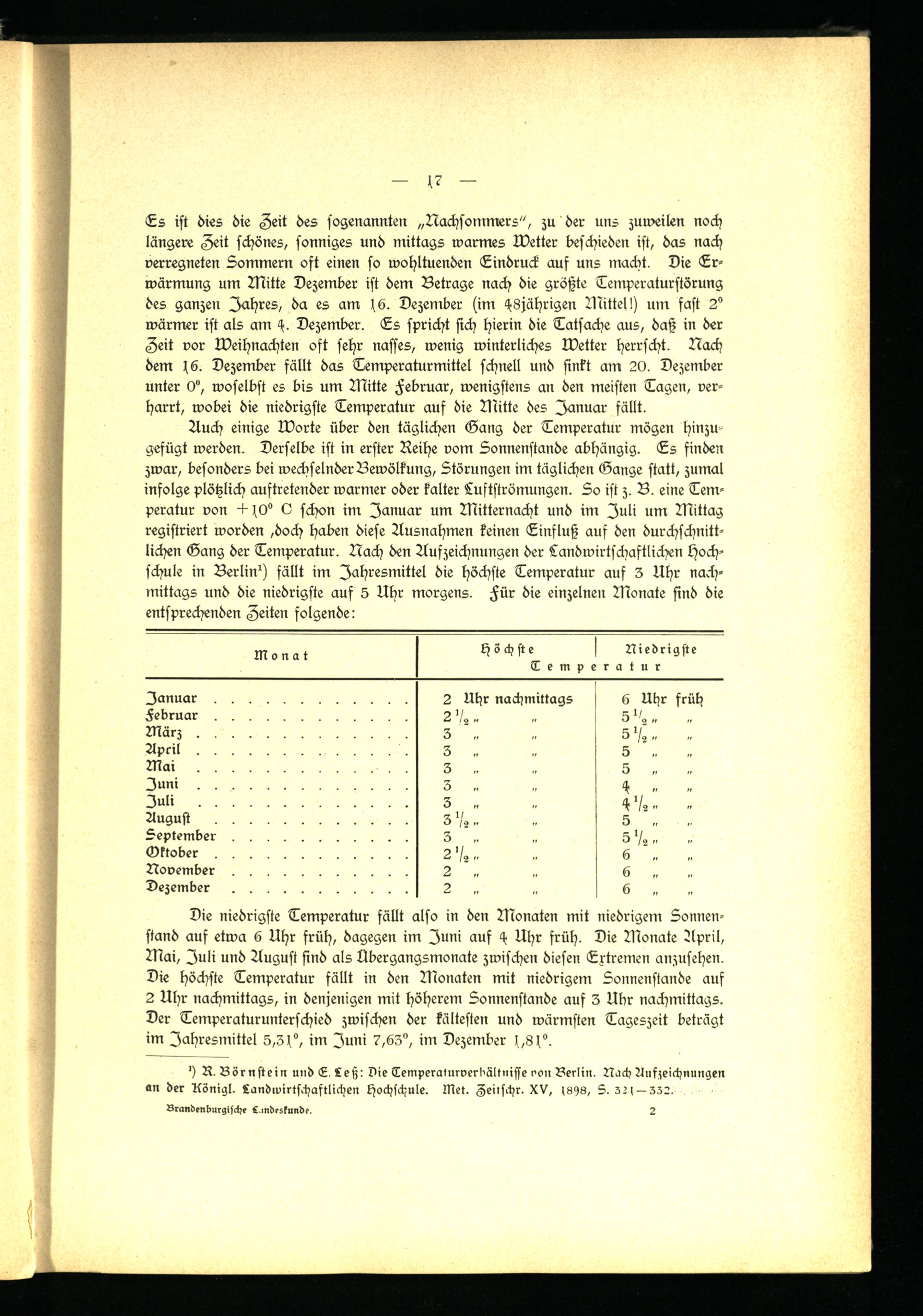 Auch einige Worte über den täglichen Gang der Temperatur mögen hinzugefügt werden. Derselbe ist in erster Reihe vom Sonnenstände abhängig. Ls finden zwar, besonders bei wechselnder Bewölkung, Störungen im täglichen Gange statt, zumal infolge plötzlich auftretender warmer oder kalter Luftströmungen. So ist z. B. eine Temperatur von -bs0° O schon im Januar um Mitternacht und im Juli um Mittag registriert worden ,doch haben diese Ausnahmen keinen Linfluß auf den durchschnittlichen Gang der Temperatur. Nach den Aufzeichnungen der Landwirtschaftlichen Hochschule in Berlin*) fällt im Jahresmittel die höchste Temperatur auf 3 Uhr nachmittags und die niedrigste auf 5 Uhr morgens. Für die einzelnen Monate sind die entsprechenden Zeiten folgende: