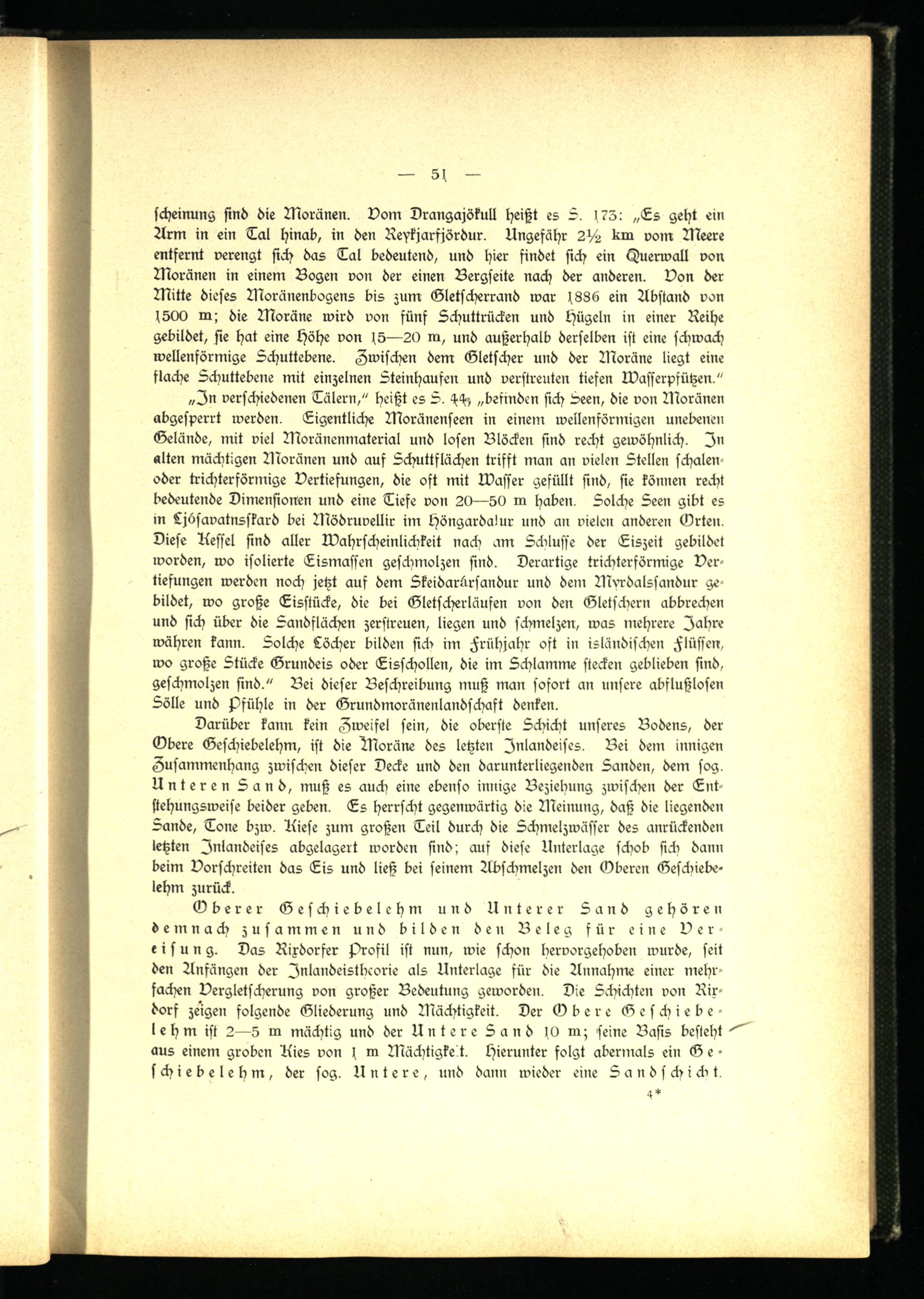 scheinung sind die Moränen. Vom Drangajökull heißt es S. > 73: „Ls geht ein Arm in ein Tai hinab, in den Reykjarfjördur. Ungefähr 2 V 2 km vom Meere entfernt verengt sich das Tal bedeutend, und hier findet sich ein Huerwall von Moränen in einem Bogen von der einen Bergseite nach der anderen. Von der Mitte dieses Moränenbogens bis zum Gletscherrand war s886 ein Abstand von 1500 m; die Moräne wird von fünf Schuttrücken und Hügeln in einer Reihe gebildet, sie hat eine höhe von 15—20 m, und außerhalb derselben ist eine schwach wellenförmige Schuttebene. Zwischen dem Gletscher und der Moräne liegt eine flache ächuttebene mit einzelnen Steinhaufen und verstreuten tiefen IVasserpfützen."