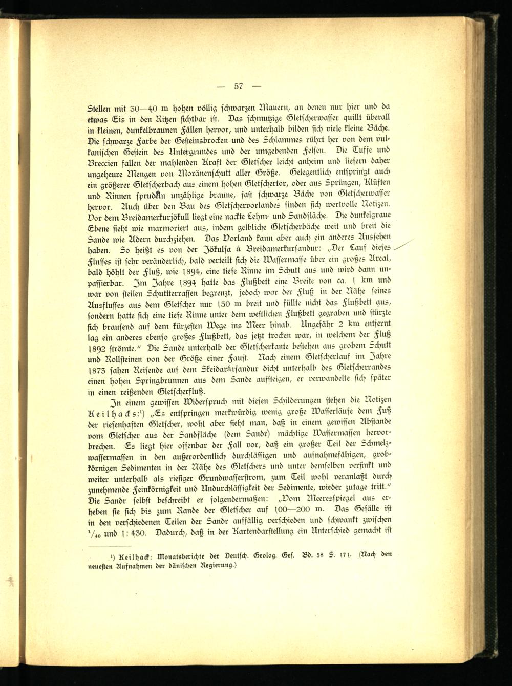 In einem gewissen Widerspruch mit diesen Schilderungen stehen die Notizen Aeilhacks:') „Es entspringen merkwürdig wenig große Wasserläufe dem Fuß der riesenhaften Gletscher, wohl aber sieht man, daß in einem gewissen Abstande vom Gletscher aus der Sandfläche (dem Sandr) mäcbtige Wassermassen Hervorbrechen. Es liegt hier offenbar der Fall vor, daß ein großer Teil der Schmelzwassermassen in den außerordentlich durchlässigen und aufnahmefähigen, grobkörnigen Sedimenten in der Nähe des Gletschers und unter demselben versinkt und weiter unterhalb als riesiger Grundwasserstrom, zum Teil wohl veranlaßt durch zunehmende Feinkörnigkeit und Undurchlässigkeit der Sedimente, wieder zutage tritt." Die Sandr selbst beschreibt er folgendernraßen: „Vom Meeresspiegel aus er