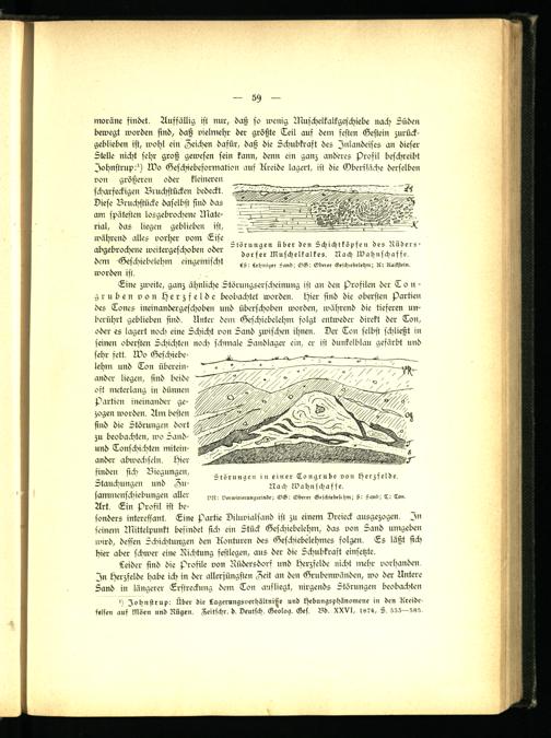 lehm und Ton übereinander liegen, sind beide oft meterlang in dünnen Partien ineinander gezogen worden. Am besten sind die Störungen dort zu beobachten, wo Sand- und Tonschichten miteinander abwecbseln. Hier finden sicb Biegungen,