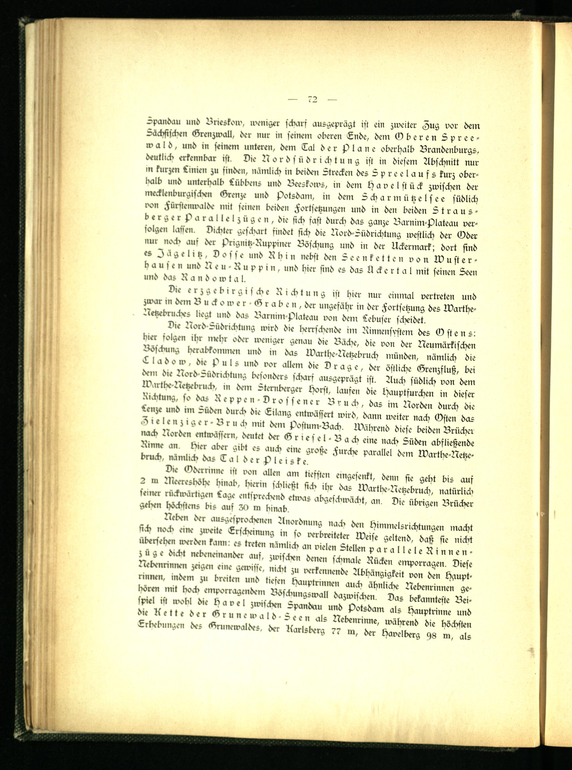 Die Oderrinne ist von allen am tiefsten emgesenkt, denn sie geht bis aus 2 m Bleeresbähe hinab, hierin schließt nch ihr das Wartbe-Betzebruch, natürlich seiner rückivärtigen Lage entspreck'end etwas abgesclnväci't, an. Die übrigen Brücker geben höchstens bis auf 30 m hinab