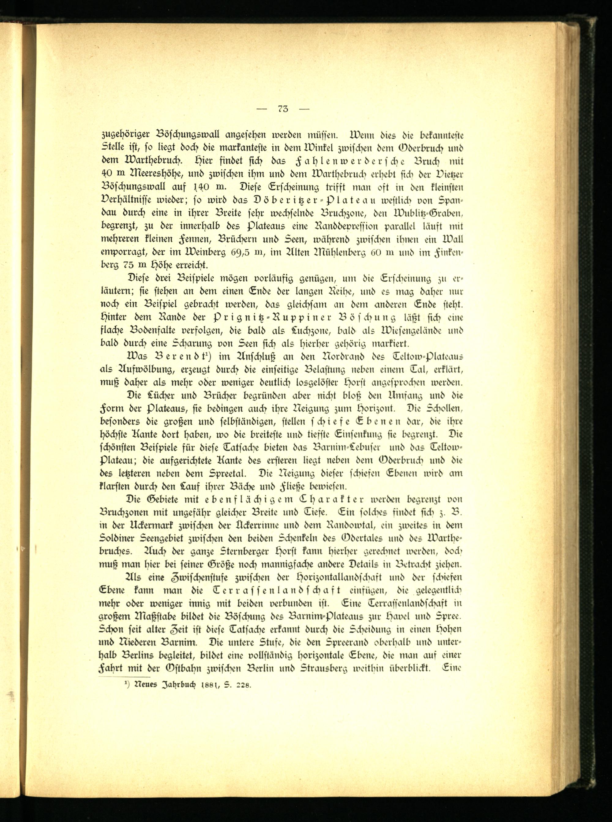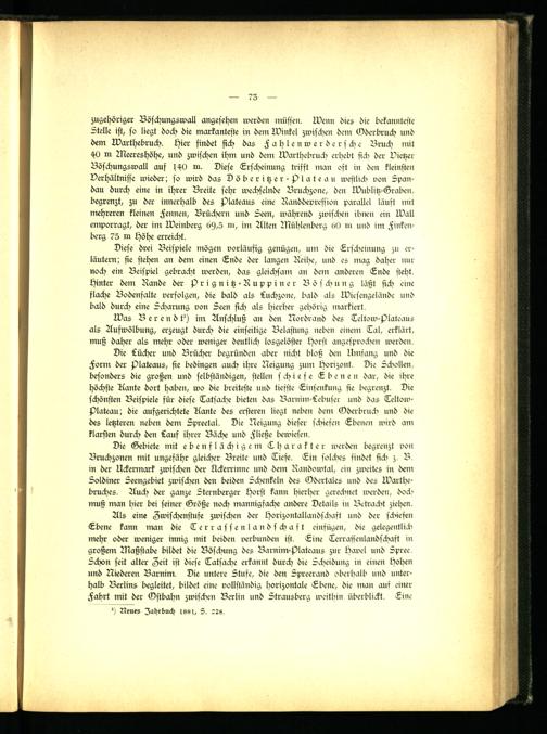 zugehöriger Böschungswall angesehen werden müssen. wenn dies die bekannteste Stelle ist, so liegt doch die markanteste in dem Winkel zwischen dein Äderbruch und dem Warthebruch, hier findet sich das F a h l e n w e r d e r s ch e Bruch mit 40 m Meereshöhe, und zwischen ihm und dem Warthebruch erhebt sieb der Vietzer Böschungswall auf s40 m. Diese Erscheinung trifft man oft in den kleinsten Verhältnisse wieder; so wird das Döberitzer-Plateau westlich von Spandau durch eine in ihrer Breite sehr wechselnde Bruchzone, den Wublitz-Graben, begrenzt, zu der innerhalb des Plateaus eine Randdevression parallel läuft mit mehreren kleinen Fennen, Brüchern und Seen, während zwiscben ibnen ein Wall emporragt, der im Weinberg 6st,5 m, im Alten Mühlenberg 60 in und im Finkende rg 75 in höhe erreicht.
