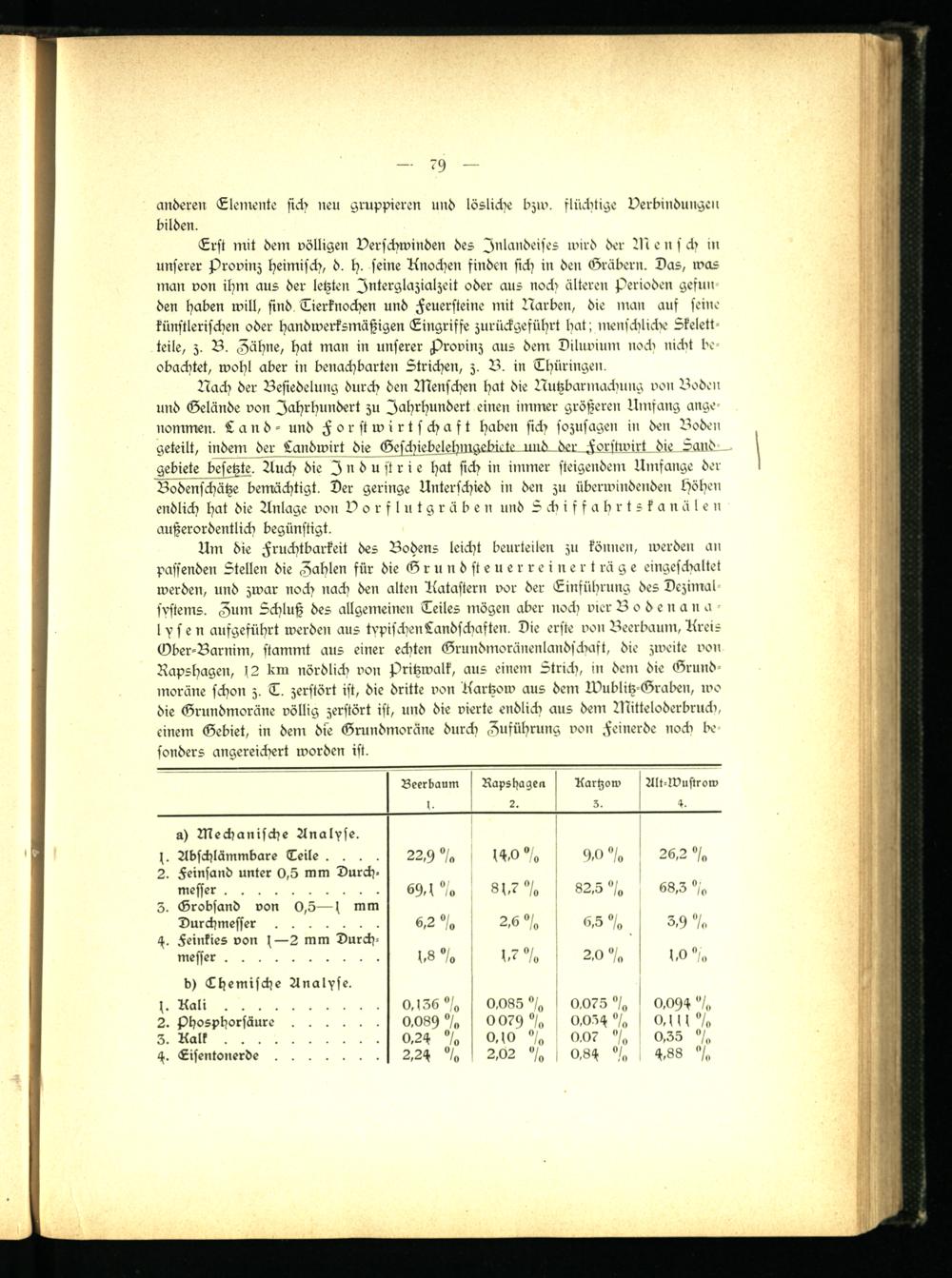 Um die Fruchtbarkeit des Bodens leicht beurteilen zu können, werden au passenden Stellen die Zablen für die G r u n d st e u e r re i n e r t rä g e eingeschaltet werden, und zwar noch nach den alten Katastern vor der Einführung des Dezimalsystems. Zum Schluß des allgemeinen Teiles mögen aber noch vier Bodenana lysen ausgeführt werden aus typischsnLandschaften. Die erste von Beerbaum, Kreis Gber-Barnim, stammt aus einer echten Grundmoränenlandsckxift, die zweite von Rapshagen, f2 km nördlich von pritzwalk, aus einem Strich, in dem die Grund- moräne schon z. T. zerstört ist, die dritte von Kartzow aus dem IVublitz-Graben, wo die Grundmoräne völlig zerstört ist, und die vierte endlich aus dem Mitteloderbruck', einem Gebiet, in dem die Grundmoräne durch Zuführung von Feinerde nocb lv sonders angereichert worden ist.