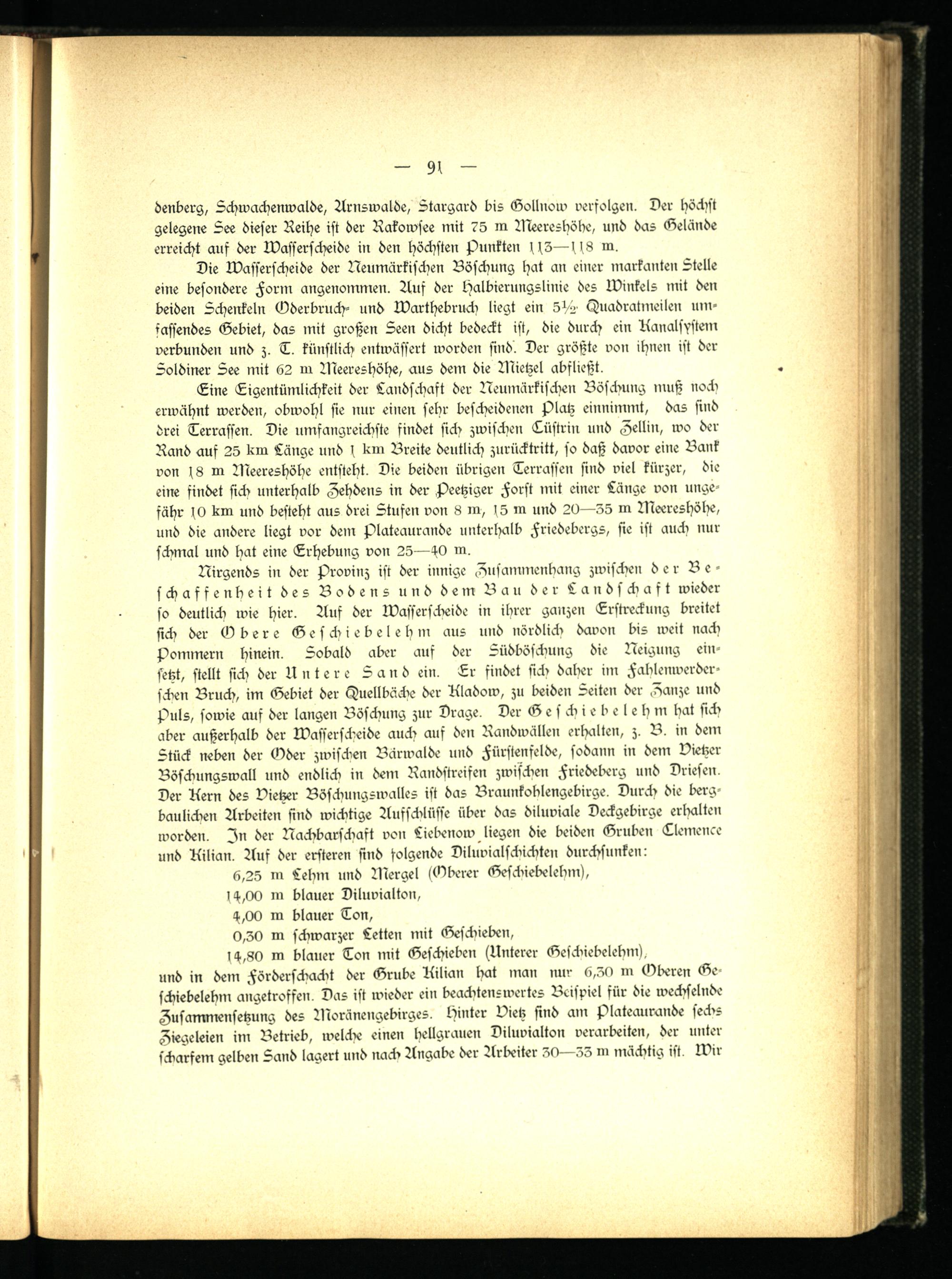 1-4,80 m blauer Ton mit Geschieben (Unterer Geschiebelebm), und in dem Hörderschacht der Grube Ailian trat man nur 6,30 m Gberen Ge schiebelehm angetroffen. Das ist wieder ein beachtenswertes Beispiel für die wechselnde Zusammensetzung des Uloränengebirges. lsinter vietz sind ain Plateaurande sechs Ziegeleien im Betrieb, welckie einen hellgrauen Diluvialton verarbeiten, der unter scharfem gelben Sand lagert und nach Angabe der Arbeiter 30—55 m mächtig ist Wir