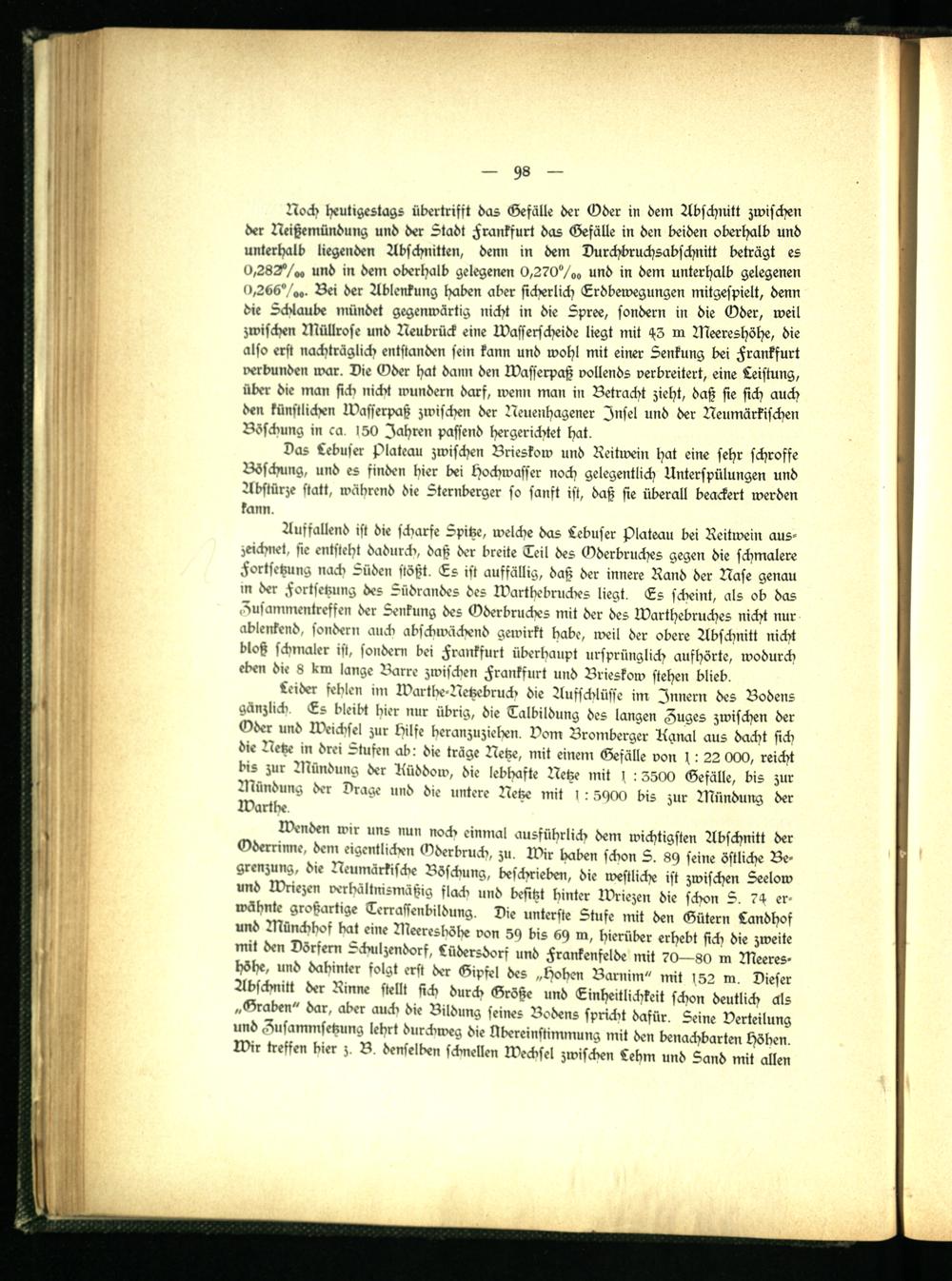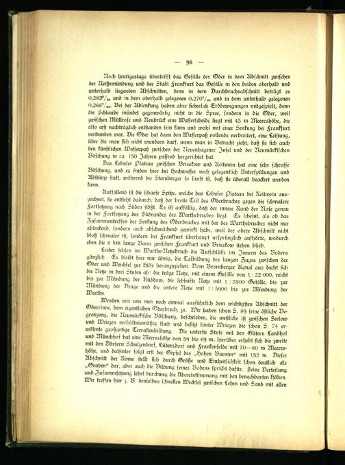 Noch heutigestags übertrifft da- Gefälle der Oder in dem Abschnitt zwischen der Neißemündung und der Stadt Frankfurt das Gefälle in den beiden oberhalb und unterhalb liegenden Abschnitten, denn in dem Durchbruchsabschnitt beträgt es 0 , 283 °/«« und in dem oberhalb gelegenen 0,270°/«, und in dem unterhalb gelegenen 0 , 266 °/»«. Bei der Ablenkung haben aber sicherlich Erdbewegungen mitgespielt, denn die Scbtaube mündet gegenwärtig nicht in die Spree, sondern in die Oder, weil zwischen Müllrose und Neubrück eine Wasserscheide liegt mit m Meereshöhe, die also erst nachträglich entstanden sein kann und wohl mit einer Lenkung bei Frankfurt verbunden »var. Die Oder hat dann den wasserpaß vollends verbreitert, eine Leistung, über die man sich nicht wundern darf, wenn man in Betracht zieht, daß sie sich auch den künstlichen lvasserpaß zwischen der Neuenhagener Insel und der Neumärkischen Böschung in ca. >50 Jahren passend hergerichtet hat.