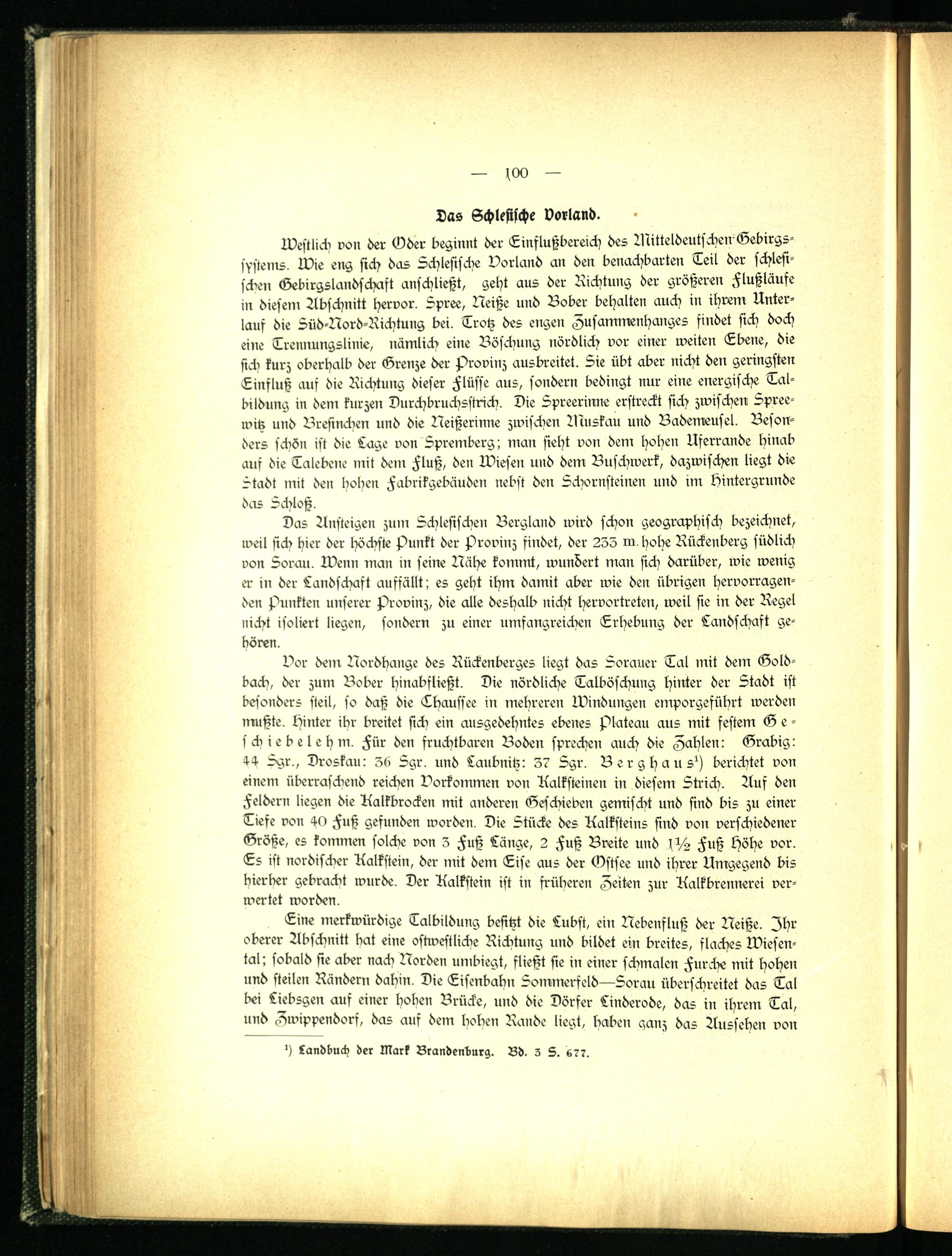 Das Ansteigen zum Schlesischen Bergland wird schon geographisch bezeichnet, weil sich hier der höchste Punkt der Provinz findet, der 233 m. hohe Rückenberg südlich von Sorau. wenn man in seine Nähe kommt, wundert man sich darüber, wie wenig er in der Landsckxift ausfällt; es geht ihm damit aber wie den übrigen hervorragenden Punkten unserer Provinz, die alle deshalb nicht hervortreten, weil sie in der Regel nicht isoliert liegen, sondern zu einer umfangreichen Erhebung der Landschaft gehören.