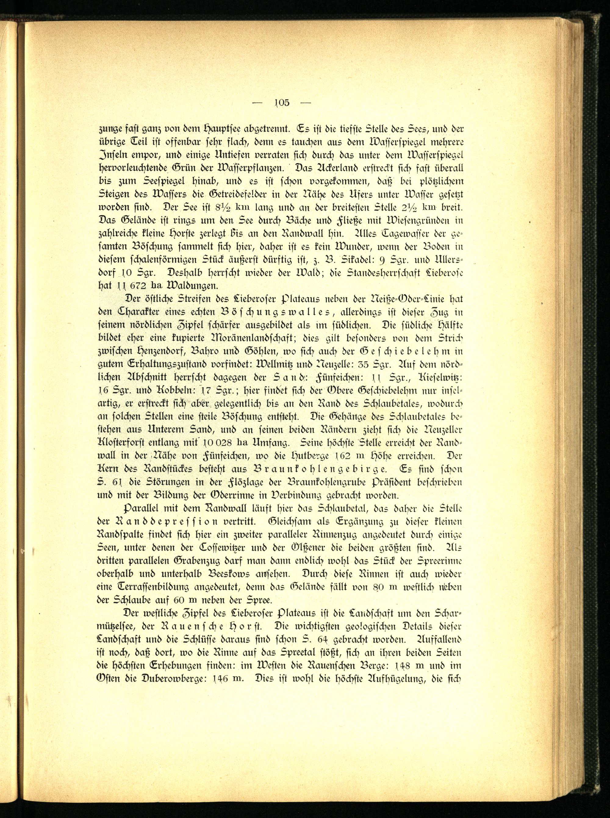 parallel mit dem Randwall läuft hier das Schlaubetal, das daher die Stelle der Randdepression vertritt. Gleichsam als Ergänzung zu dieser kleinen Randspalte findet sich hier ein zweiter paralleler Rinnenzug angedeutet durch einige Seen, unter denen der Tossewitzer und der Mlßener die beiden größten sind. Als dritten parallelen Grabenzug darf man dann endlich wohl das Stück der Spreerinne oberhalb und unterhalb Beeskows ansehen. Durch diese Rinnen ist auch wieder eine Terrassenbildung angedeutet, denn das Gelände füllt von 80 m westlick neben der Schlaube auf 60 m neben der Spree.