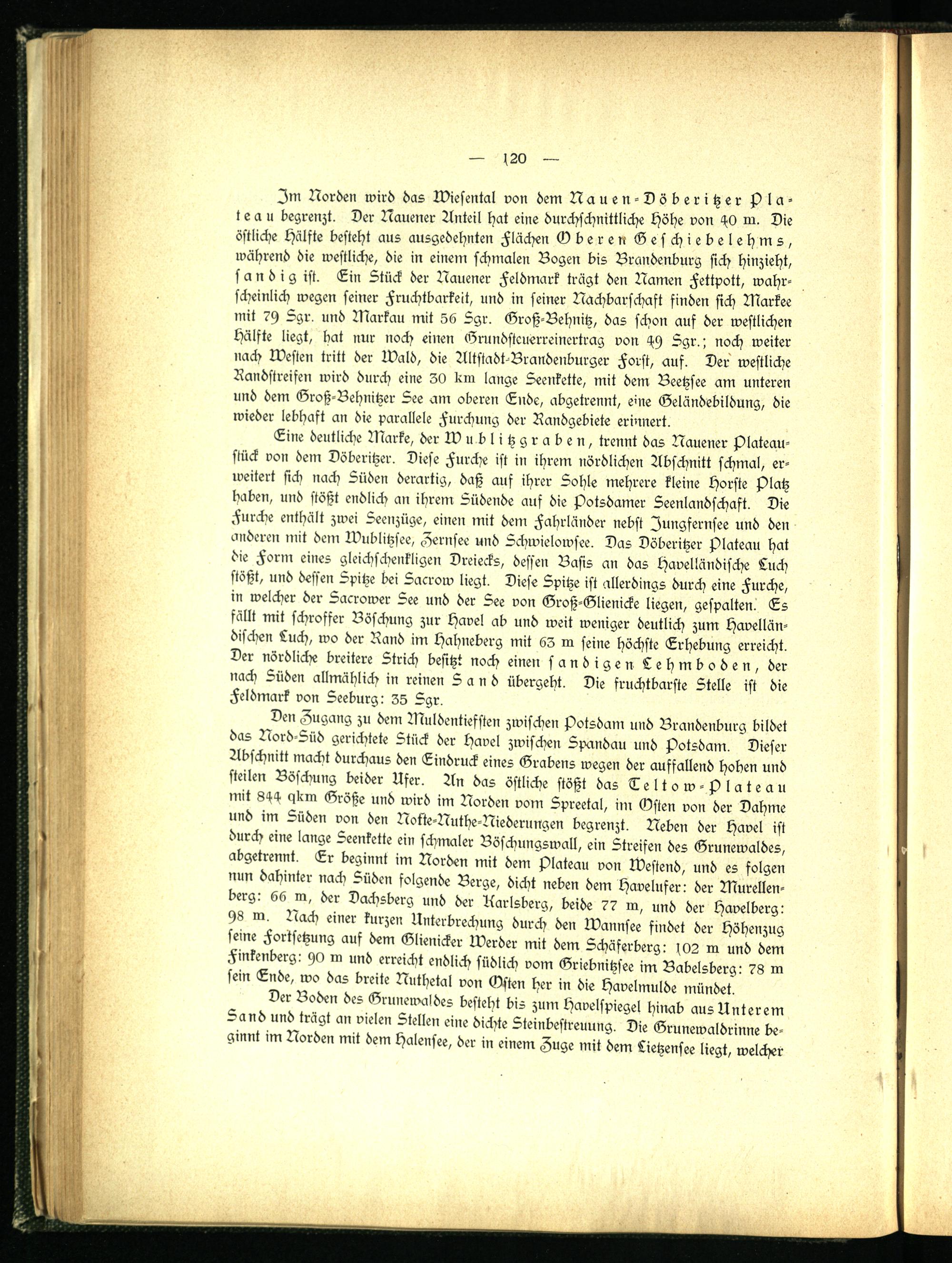 Zm Norden wird das Wiesental von dem Nauen-Döberitzer Plateau begrenzt. Der Nauener Anteil hat eine durchschnittliche Höhe von 40 m. Die östliche Hälfte besteht aus ausgedehnten Aachen Oberen Geschiebelehms, während die westliche, die in einem schmalen Bogen bis Brandenburg sich hinzieht, sandig ist. Lin Stück der Nauener Feldmark trägt den Namen Fettpott, wahrscheinlich wegen seiner Fruchtbarkeit, und in seiner Nachbarschaft finden sich Markee mit ?9 Sgr. und Markau mit 56 Sgr. Groß-Behnitz, das schon auf der westlichen Hälfte liegt, hat nur noch einen Grundsteuerreinertrag von 49 Sgr.', noch weiter nach Westen tritt der Wald, die Altstadt-Brandenburger Forst, auf. Der westliche Randstreifen wird durch eine 30 bin lange Seenkette, mit dem Beetzsee am unteren und dem Groß-Behnitzer See am oberen Ende, abgetrennt, eure Geländebildung, die wieder lebhaft an die parallele Furchung der Randgebiete erinnert.
