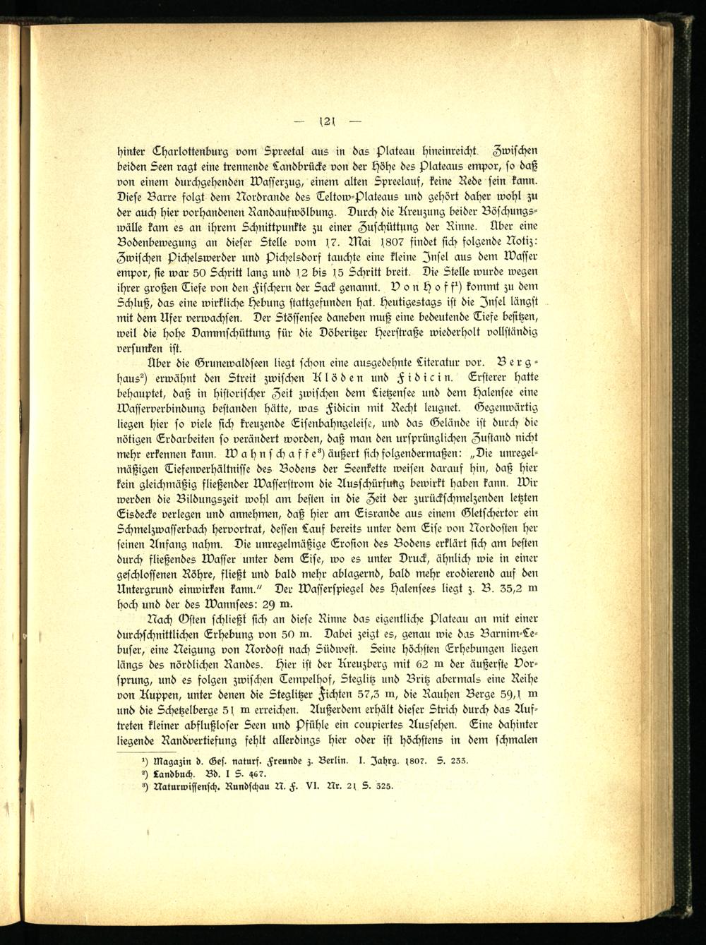 Uber die Grunewaldseen liegt schon eine ausgedehnte Literatur vor. Berg - haush erwähnt den Streit zwischen Klöden und Fidicin. Ersterer hatte behauptet, daß in historischer Zeit zwischen dem Lietzensee und dem Halensee eine Wasserverbindung bestanden hätte, was Fidicin mit Recht leugnet. Gegenwärtig liegen hier so viele sich kreuzende Eisenbahngeleise, und das Gelände ist durch die nötigen Erdarbeiten so verändert worden, daß man den ursprünglichen Zustand nicht mehr erkennen kann. Wahnschaf fe^) äußert sich folgendermaßen: „Die unregelmäßigen Tiefenverhältnisse des Bodens der Seenkette weisen darauf hin, daß hier kein gleichmäßig fließender Wasserstrom die Ausschürfukig bewirkt haben kann. Wir werden die Bildungszeit wohl am besten in die Zeit der zurückschmelzenden letzten Eisdecke verlegen und annehmen, daß hier am Eisrande aus einem Gletschertor ein Schmelzwasserbach hervortrat, dessen Lauf bereits unter dem Eise von Nordosten her- feinen Anfang nahm. Die unregelmäßige Erosion des Bodens erklärt sich am besten durch fließendes Wasser unter dem Eise, wo es unter Druck, ähnlich wie in einer geschlossenen Röhre, fließt und bald mehr ablagernd, bald mehr erodierend auf den Untergrund einwirken kann." Der Wasserspiegel des Halensees liegt z. B. 35,2 m hoch und der des Wannsees: 2st m.
