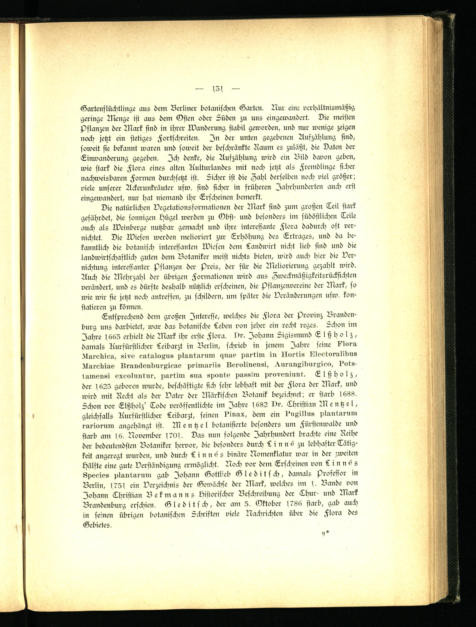 Entsprechend dem großen Interesse, welches die Flora der Provinz Brandenburg uns darbietet, war das botanische Leben von jeher ein recht reges. Schon im Jahre (663 erhielt die Mark ihr erste Flora. Itr. Johann Sigismund Elßholz, damals kurfürstlicher Leibarzt in Berlin, schrieb in jenem Jahre seine I'loru Narcüiea, sivu oataloAns plantarnm quao partim in Nortis lilleotoralibus Nareüiao LranüonburKicae prlmariis Lerolinonsi, .^.nranKibuiAico, ?ots- tamonsi oxcolnntnr, partim sna sponto passim proveniunt. Elßholz, der 1623 geboren wurde, beschäftigte sich sehr lebhaft mit der Flora der Mark, und wird mit Recht als der Vater der Märkischen Botanik bezeichnet; er starb 1688. Schon vor Elßholz' Tode veröffentlichte im Jahre 1682 vr. Lhristian Mentzel, gleichfalls Aurfürstlicher Leibarzt, seinen Dinax, dem ein lCnAillus plantarnm rariornm angehängt ist. Mentzel botanisierte besonders um Fürstenwalde und starb am 16. November 170s. Das nun folgende Jahrhundert brachte eine Reihe der bedeutendsten Botaniker hervor, die besonders durch Linnö zu lebhafter Tätigkeit angeregt wurden, und durch Linn 6 s binäre Nomenklatur war in der zweiten Hälfte eine gute Verständigung ermöglicht. Noch vor dem Erscheinen von Linn 6 s Kpeeies plantarnm gab Johann Gottlieb Gleditsch, damals Professor in Berlin, 1751 ein Verzeichnis der Gewächse der Mark, welches im 1. Bande von Johann Thristian Bekmanns Historischer Beschreibung der Thur- und Mark Brandenburg erschien. Gleditsch, der am 5. (Oktober 1786 starb, gab auch in seinen übrigen botanischen Schriften viele Nachrichten über die Flora des Gebietes.