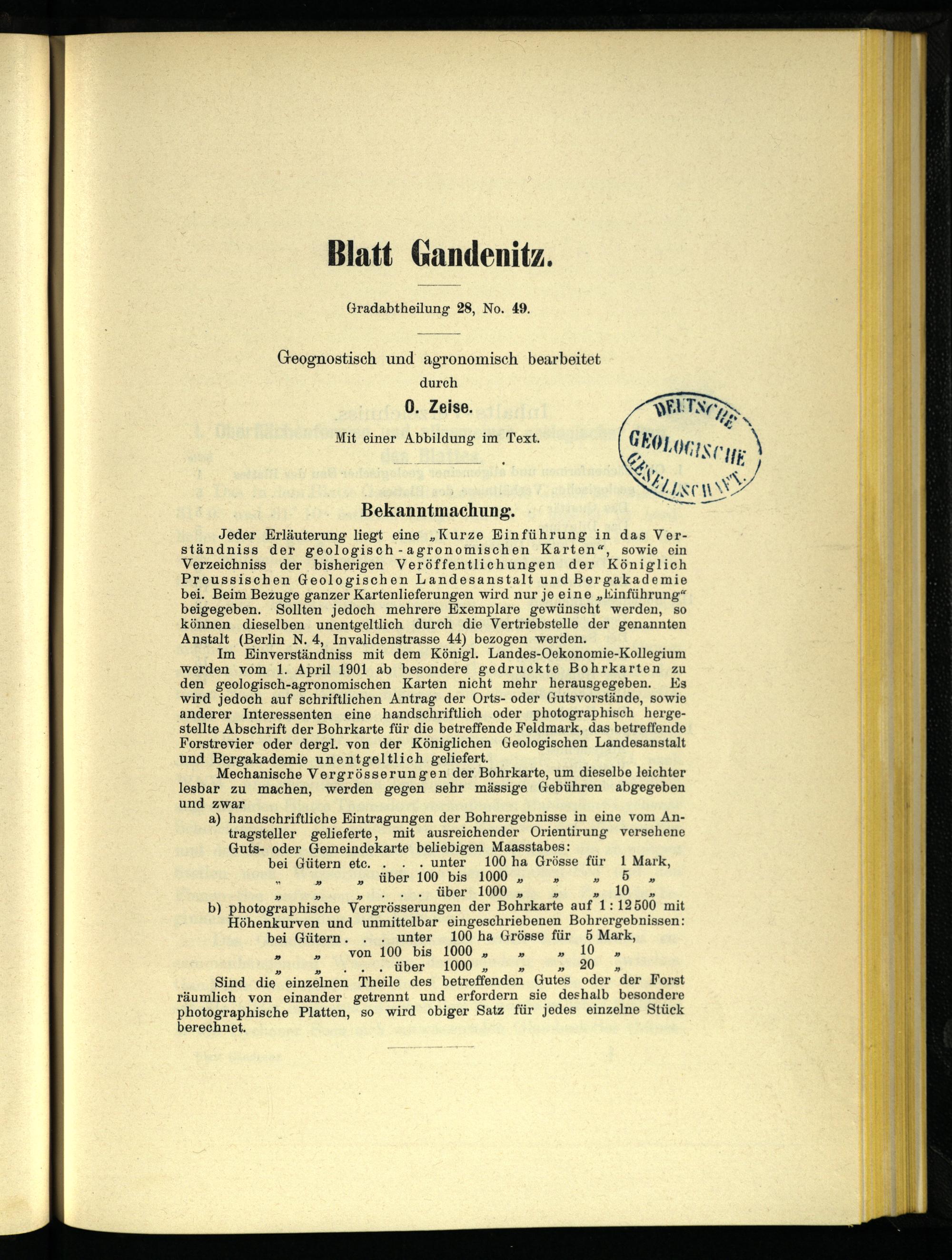 Im Einverständnis mit dem Königl. Landes-Oekonomie-Kollegium werden vom 1. April 1901 ab besondere gedruckte Bohrkarten zu den geologisch-agronomischen Karten nicht mehr herausgegeben. Es wird jedoch auf schriftlichen Antrag der Orts- oder Gutsvorstände, sowie anderer Interessenten eine handschriftlich oder photographisch hergestellte Abschrift der Bohrkarte für die betreffende Feldmark, das betreffende Forstrevier oder dergl. von der Königlichen Geologischen Landesanstalt und Bergakademie unentgeltlich geliefert.