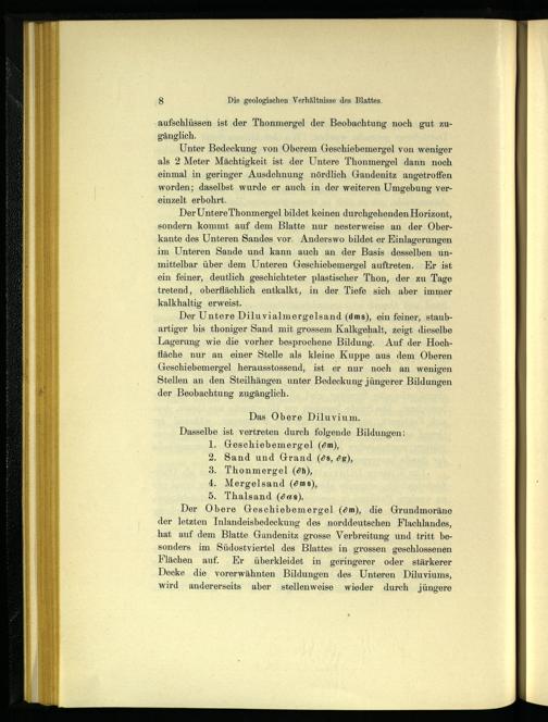 Der Obere Geschiebemergel (dm), die Grundmoräne der letzten Inlandeisbedeckung des norddeutschen Flachlandes, hat auf dem Blatte Gandenitz grosse Verbreitung und tritt besonders im Südostviertel des Blattes in grossen geschlossenen Flächen auf. Er überkleidet in geringerer oder stärkerer Decke die vorerwähnten Bildungen des Unteren Diluviums, wird andererseits aber stellenweise wieder durch jüngere