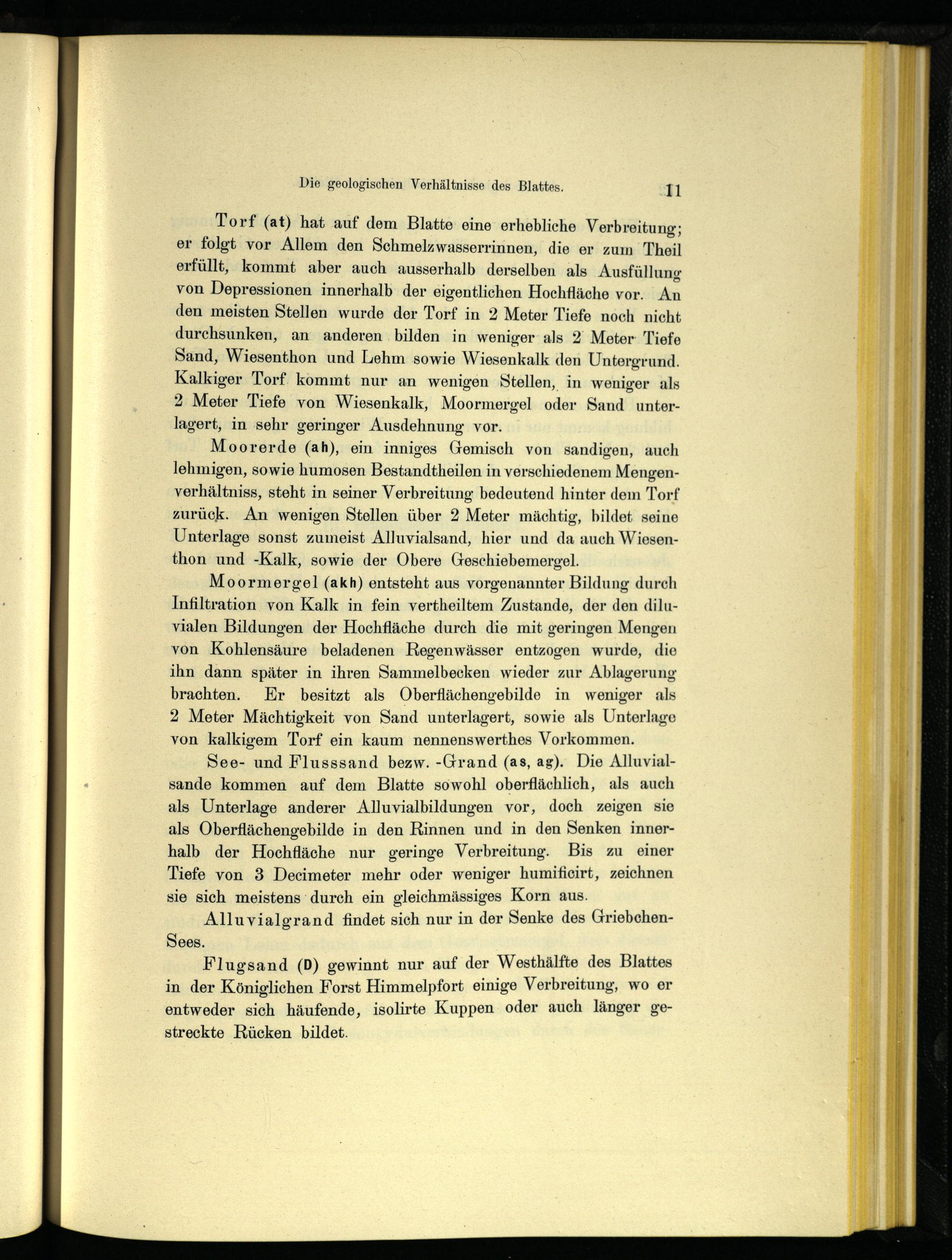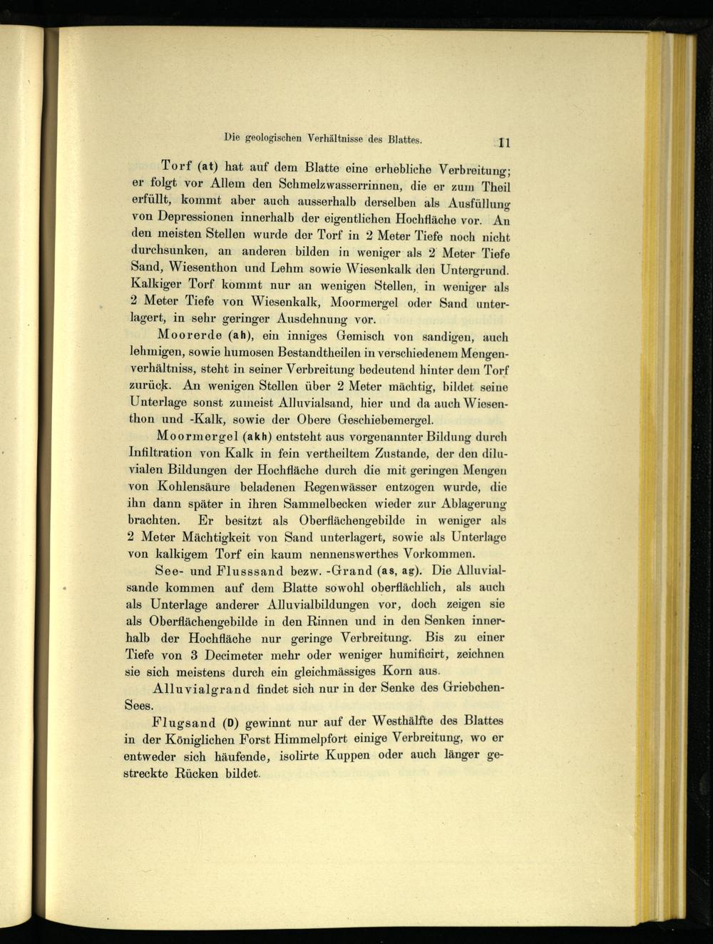 Torf (at) hat auf dem Blatte eine erhebliche Verbreitung; er folgt vor Allem den Schmelzwasserrinnen, die er zum Theil erfüllt, kommt aber auch ausserhalb derselben als Ausfüllung von Depressionen innerhalb der eigentlichen Hochfläche vor. An den meisten Stellen wurde der Torf in 2 Meter Tiefe noch nicht durchsunken, an anderen bilden in weniger als 2 Meter Tiefe Sand, Wiesenthon und Lehm sowie Wiesenkalk den Untergrund. Kalkiger Torf kommt nur an wenigen Stellen, in weniger als 2 Meter Tiefe von Wiesenkalk, Moormergel oder Sand unter- lagert, in sehr geringer Ausdehnung vor.