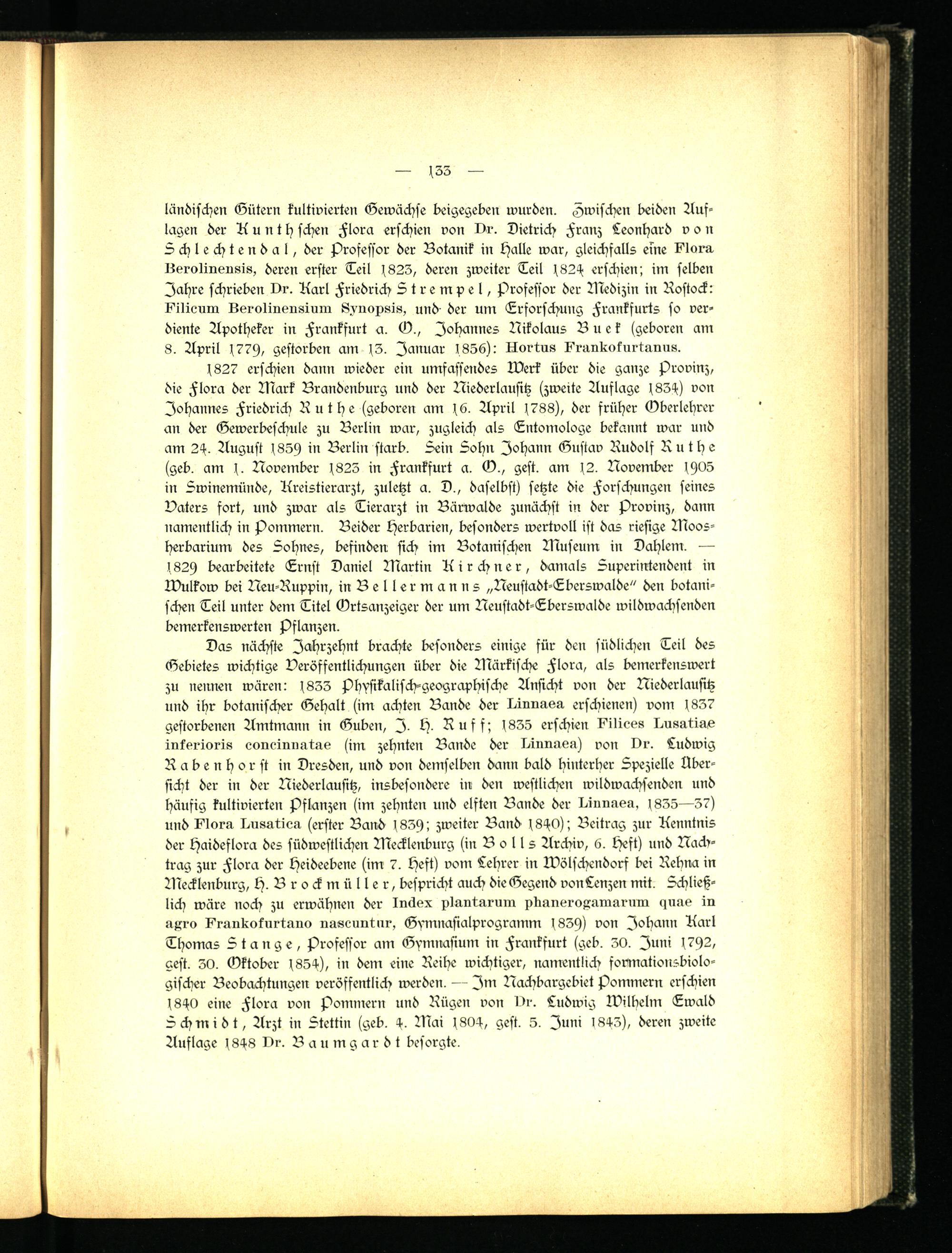 1827 erschien dann wieder ein umfassendes Werk über die ganze Provinz, die Flora der Mark Brandenburg und der Niederlausitz (zweite Auflage 183-1) von Johannes Friedrich Ruthe (geboren am 16. April 1788), der früher Oberlehrer an der Gewerbeschule zu Berlin war, zugleich als Entomologe bekannt war und am 2-1. August 185h in Berlin starb. Sein Sohn Johann Gustav Rudolf Ruthe (geb. am 1. November 1825 in Frankfurt a. O., gest. am 12. November 1H05 in Swinemünde, Areistierarzt, zuletzt a. D., daselbst) setzte die Forschungen seines Bakers fort, und zwar als Tierarzt in Bärwalde zunächst in der Provinz, dann namentlich in Pommern. Beider Herbarien, besonders wertvoll ist das riesige Moosherbarium des Sohnes, befinden sich im Botanischen Museum in Dahlem. — 182h bearbeitete Ernst Daniel Martin Airchner, damals Superintendent in Wulkow bei Neu-Ruppin, in Bellermanns „Neustadt-Eberswalde" den botanischen Teil unter dem Titel Grtsanzeiger der um Neustadt-Eberswalde wildwachsenden bemerkenswerten Pflanzen.