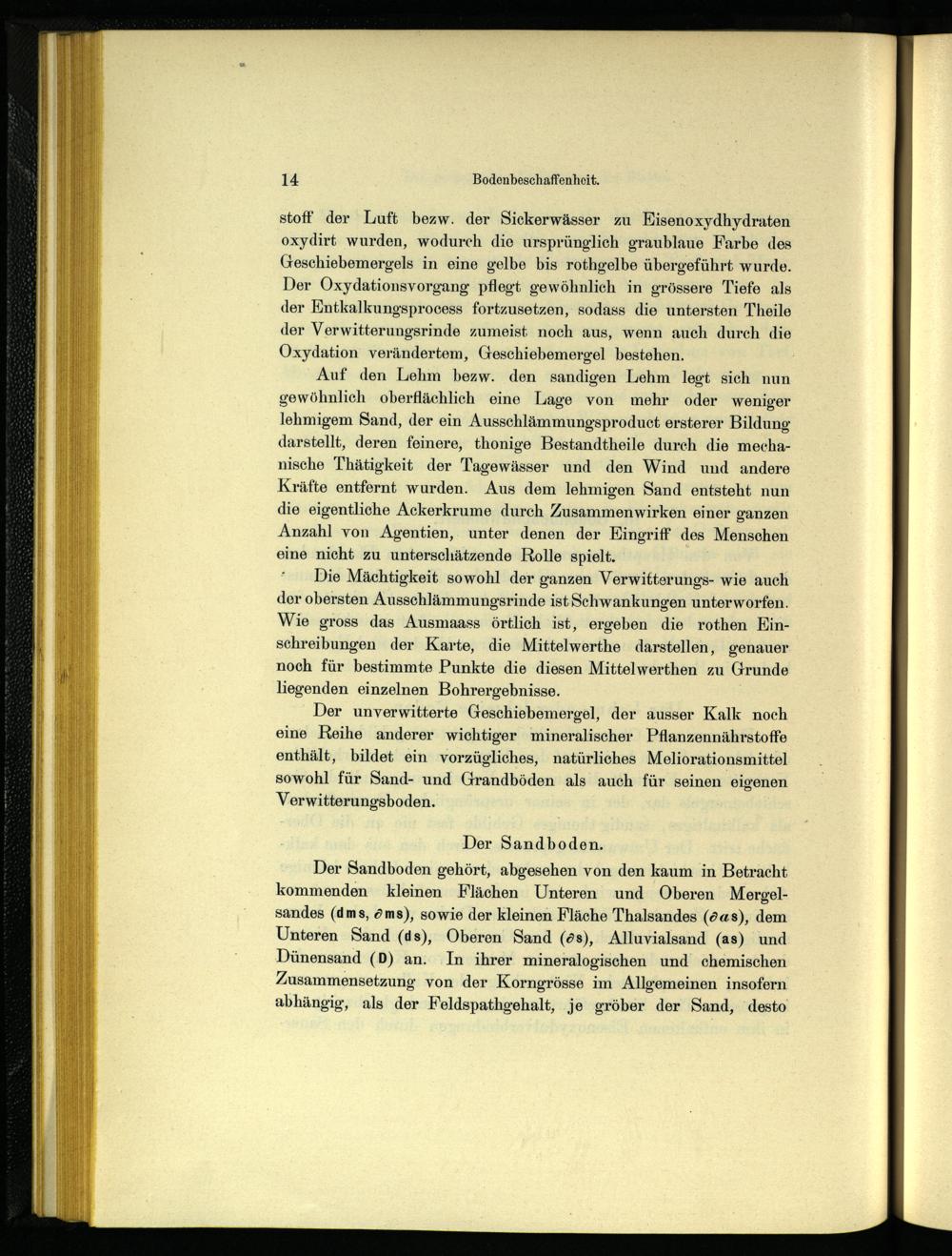 Der Sandboden gehört, abgesehen von den kaum in Betracht kommenden kleinen Flächen Unteren und Oberen Mergelsandes (dms, ^ms ), sowie der kleinen Fläche Thalsandes {da s), dem Unteren Sand (ds), Oberen Sand (ds), Alluvialsand (as) und Dünensand (D) an. In ihrer mineralogischen und chemischen Zusammensetzung von der Korngrösse im Allgemeinen insofern abhängig, als der Feldspathgehalt, je gröber der Sand, desto