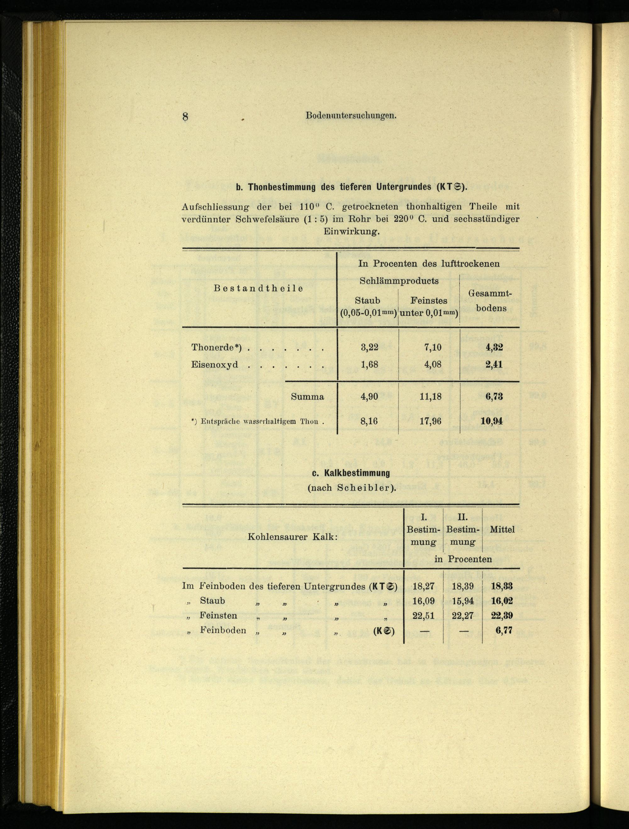 Aufschliessung der bei 110° C. getrockneten thonhaltigen Theile mit verdünnter Schwefelsäure (1 : 5) im Bohr bei 220° 0. und sechsstündiger
