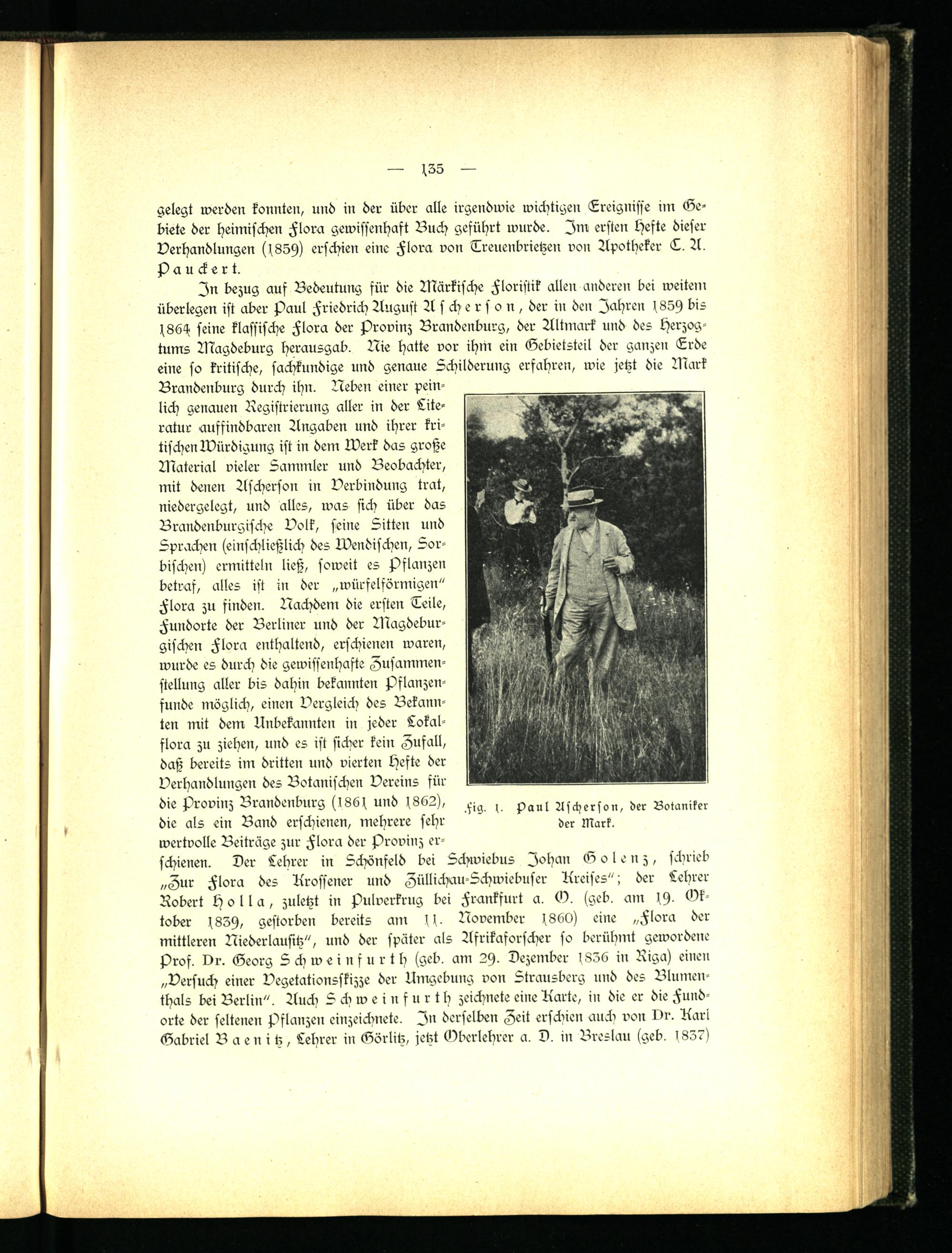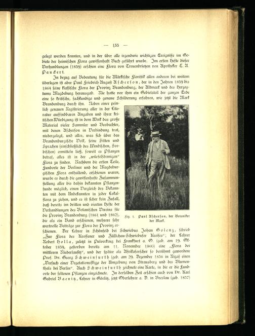 In bezug auf Bedeutung für die Märkische Floristik allen anderen bei weitem überlegen ist aber Paul Friedrich August Ascherson, -er in den Jahren 1 859 bis s86-s seine klassische Flora der Provinz Brandenburg, der Altmark und des Herzogtums Magdeburg herausgab. Nie hatte vor ihm ein Gebietsteil der ganzen Erde eine so kritische, sachkundige und genaue Schilderung erfahren, wie jetzt die Mark Brandenburg durch ihn. Neben einer peinlich genauen Registrierung aller in der Literatur auffindbaren Angaben und ihrer kritischen Würdigung ist in dem Werk das große Material vieler Sammler und Beobachter, mit denen Ascherson in Verbindung trat, niedergelegt, und alles, was sich über das Brandenburgische Volk, seine Sitten und Sprachen (einschließlich des Wendischen, Sorbischen) ermitteln ließ, soweit es Pflanzen betras, alles ist in der „würfelförmigen"