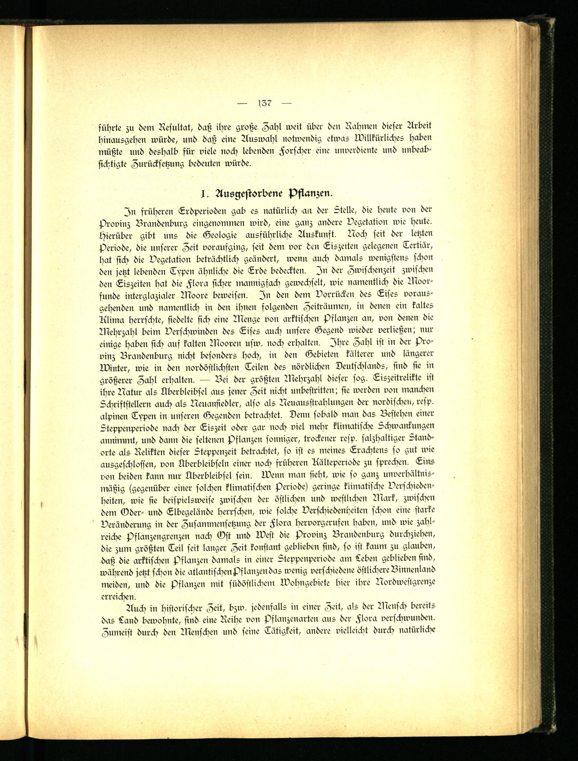 Zn früheren Erdperioden gab es natürlich an der stelle, die heute von der Provinz Brandenburg eingenommen wird, eine ganz andere Vegetation wie heute. Hierüber gibt uns die Geologie ausführliche Auskunft. Noch seit der letzten Periode, die unserer Zeit voraufging, seit dem vor den Eiszeiten gelegenen Tertiär, hat sich die Vegetation beträchtlich geändert, wenn auch damals wenigstens schon den jetzt lebenden Typen ähnliche die Erde bedeckten. Zn der Zwischenzeit zwischen den Eiszeiten hat die Flora sicher mannigfach gewechselt, wie namentlich die Moor- funde interglazialer Moore beweisen. Zn den dem Vorrücken des Eises vorausgehenden und namentlich in den ihnen folgenden Zeiträumen, in denen ein kaltes Alima herrschte, siedelte sich eine Menge von arktischen Pflanzen an, von denen die Mehrzahl beim Verschwinden des Eises auch unsere Gegend wieder verließen; nur eürige haben sich auf kalten Mooren usw. noch erhalten. Zhre Zahl ist in der Provinz Brandenburg nicht besonders hoch, in den Gebieten kälterer und längerer Winter, wie in den nordöstlichsten Teilen des nördlichen Deutschlands, sind sie in größerer Zahl erhalten. — Bei der größten Mehrzahl dieser sog. Eiszeitrelikte ist ihre Natur als Überbleibsel aus jener Zeit nicht unbestritten; sie werden von manchen Schriftstellern auch als Neuansiedler, also als Neuausstrahlungen der nordischen, resp. alpinen Typen in unseren Gegenden betrachtet. Denn sobald man das Bestehen einer Steppenperiode nach der Eiszeit oder gar noch viel mehr klimatische Schwankungen annimmt, und dann die seltenen Pflanzen sonniger, trockener resp. salzhaltiger Standorte als Relikten dieser Steppenzeit betrachtet, so ist es meines Erachtens so gut wie ausgeschlossen, von Aberbleibseln einer noch früheren Aälteperiode zu sprechen. Eins von beiden kann nur Überbleibsel sein. Wenn man sieht, wie so ganz unverhältnismäßig (gegenüber einer solchen klimatischen Periode) geringe klimatische Verschiedenheiten, wie sie beispielsweise zwischen der östlichen und westlichen Mark, zwischen dem Oder- und Elbegelände herrschen, wie solche Verschiedenheiten schon eine starke Veränderung in der Zusammensetzung der Flora hervorgsrufen haben, und wie zahlreiche Pflanzengrenzen nach Ost und West die Provinz Brandenburg durchziehen, die zum größten Teil seit langer Zeit konstant geblieben sind, so ist kaum zu glauben, daß die arktischen Pflanzen damals in einer Steppenperiode am Leben geblieben sind, während jetzt schon die atlantischen Pflanzen das wenig verschiedene östlickiere Binnenland meiden, und die Pflanzen mit südöstlichem Wohngebiete hier ihre Nordweslgrenze erreichen.