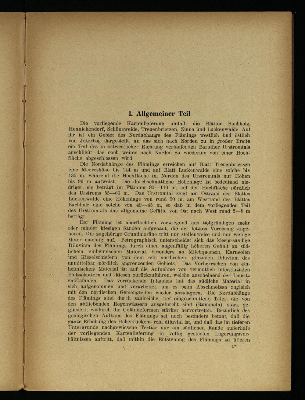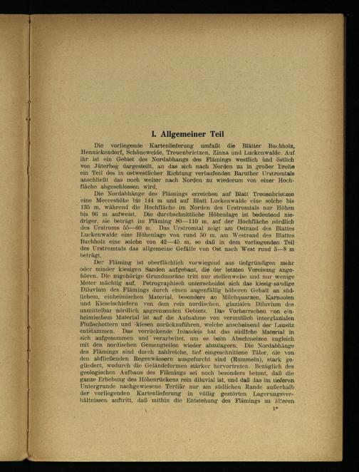 Die vorliegende Kartenlieferung umfaßt die Blätter Buchholz, Hennickendorf, Schöneweide, Treuenbrietzen , Zinna und Luckenwalde . Auf ihr ist ein Gebiet des Nordabhangs des Flämings westlich und östlich von Jüterbog dargestellt, an das sich nach Norden zu in großer Breite ein Teil des in ostwestlicher Richtung verlaufenden Baruther Urstromtals anschließt das noch weiter nach Norden zu wiederum von einer Hoch­fläche abgeschlossen wird.