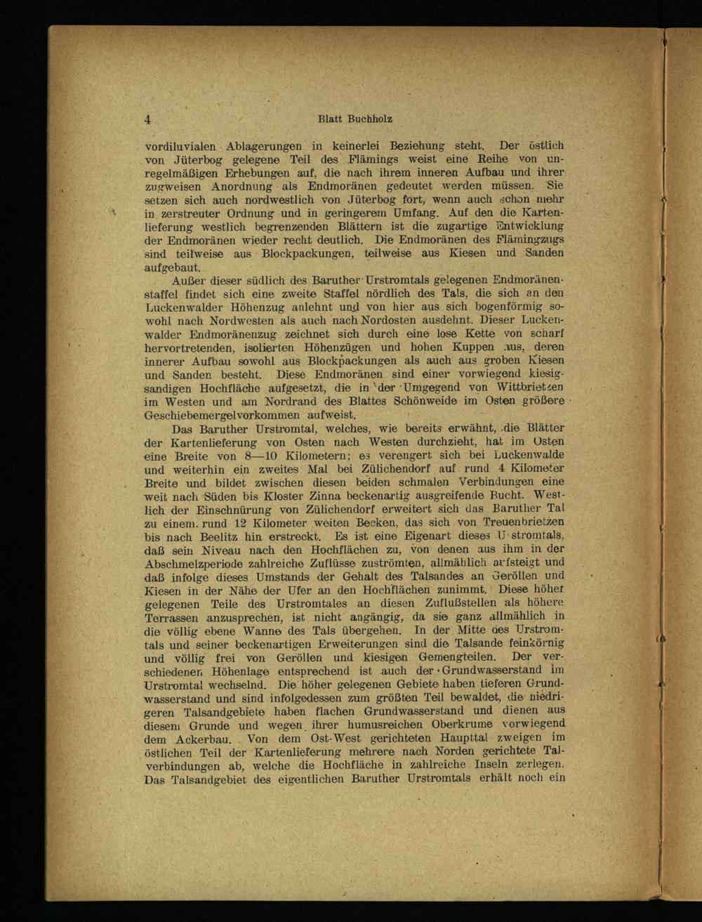 Das Baruther Urstromtal, welches, wie bereits erwähnt, die Blätter der Kartenlieferung von Osten nach Westen durchzieht, hat im Osten eine Breite von 8—10 Kilometern; es verengert sich bei Luckenwalde und weiterhin ein zweites Mal bei Zülichendorf auf rund 4 Kilometer Breite und bildet zwischen diesen beiden schmalen Verbindungen eine weit nach Süden bis Kloster Zinna beckenartig ausgreifende Bucht. Westlich der Einschnürung von Zülichendorf erweitert sich das Baruther Tal zu einem, rund 12 Kilometer weiten Becken, das sich von Treuen brietzen bis nach Beelitz hin erstreckt. Es ist eine Eigenart dieses Urstromtals, daß sein Niveau nach den Hochflächen zu, von denen aus ihm in der Abschmelzperiode zahlreiche Zuflüsse zuströmten, allmählich aufsteigt und daß infolge dieses Umstands der Gehalt des Talsandes an Gerollen und Kiesen in der Nähe der Ufer an den Hochflächen zunimmt. Diese höher gelegenen Teile des Urstromtales an diesen Zuflußstellen als höhere Terrassen anzusprechen, ist nicht angängig, da sie ganz allmählich in die völlig ebene Wanne des Tals übergehen. In der Mitte des Urstromtals und seiner beckenartigen Erweiterungen sind die Talsande feinkörnig und völlig frei von Gerollen und kiesigen Gemengteilen. Der verschiedenen Höhenlage entsprechend ist auch der Grundwasserstand im Urstromtal wechselnd. Die höher gelegenen Gebiete haben tieferen Grundwasserstand und sind infolgedessen zum größten Teil bewaldet, die niedrigeren Talsandgebiete haben flachen Grundwasserstand und dienen aus diesem Grunde und wegen ihrer humusreichen Oberkrume vorwiegend dem Ackerbau. Von dem Ost-West gerichteten Haupttal zweigen im östlichen Teil der Kartenlieferung mehrere nach Norden gerichtete Talverbindungen ab, welche die Hochfläche in zahlreiche Inseln zerlegen. Das Talsandgebiet des eigentlichen Baruther Urstromtals erhält noch ein