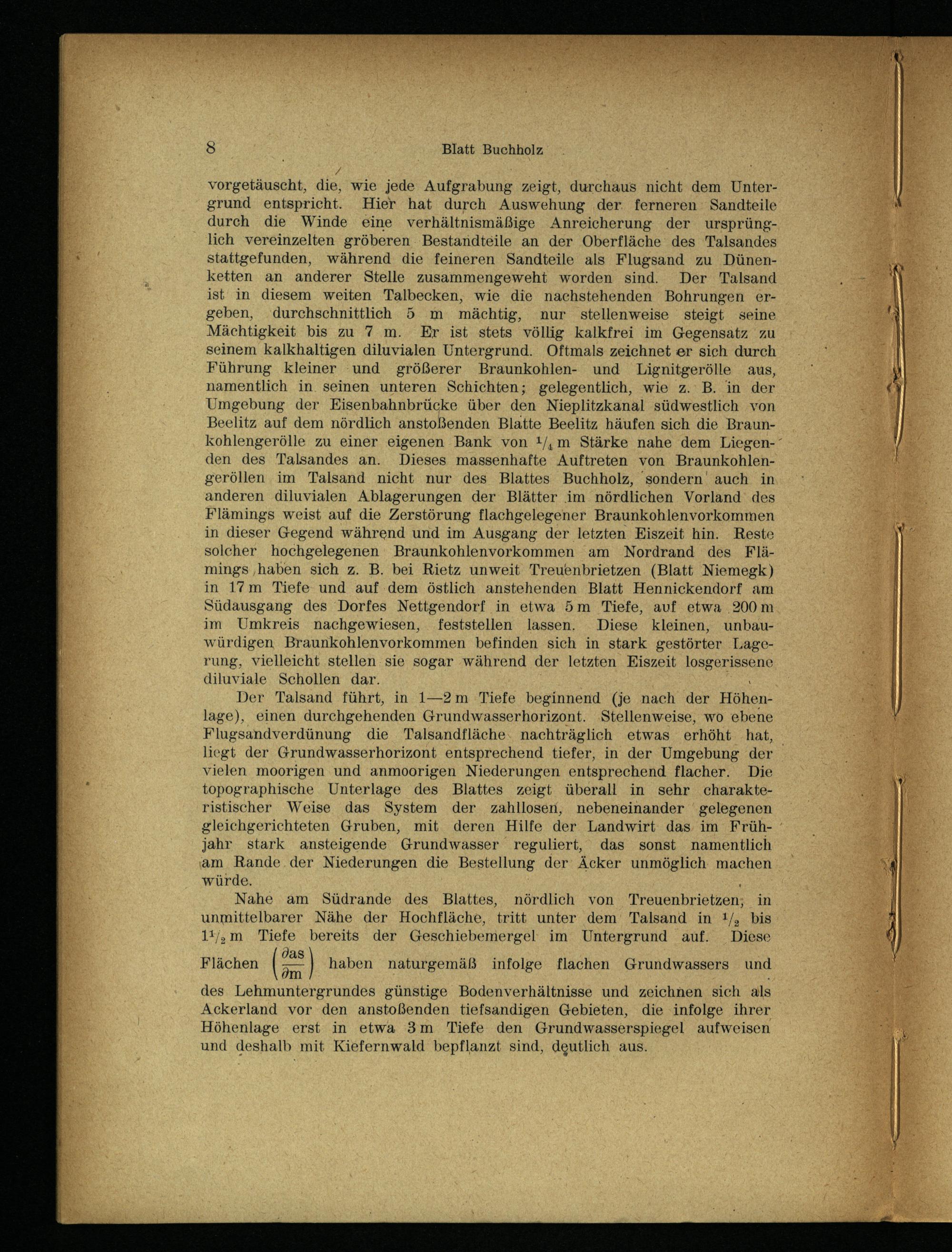 Der Talsand führt, in 12 m Tiefe beginnend (je nach der Höhen­lage), einen durchgehenden Grundwasserhorizont. Stellenweise, wo ebene Flugsandverdünung die Talsandfläche nachträglich etwas erhöht hat, liegt der Grundwasserhorizont entsprechend tiefer, in der Umgebung der vielen moorigen und anmoorigen Niederungen entsprechend flacher. Die topographische Unterlage des Blattes zeigt überall in sehr charakte­ristischer Weise das System der zahllosen, nebeneinander gelegenen gleichgerichteten Gruben, mit deren Hilfe der Landwirt das im Früh­jahr stark ansteigende Grundwasser reguliert, das sonst namentlich am Rande der Niederungen die Bestellung der Äcker unmöglich machen würde.