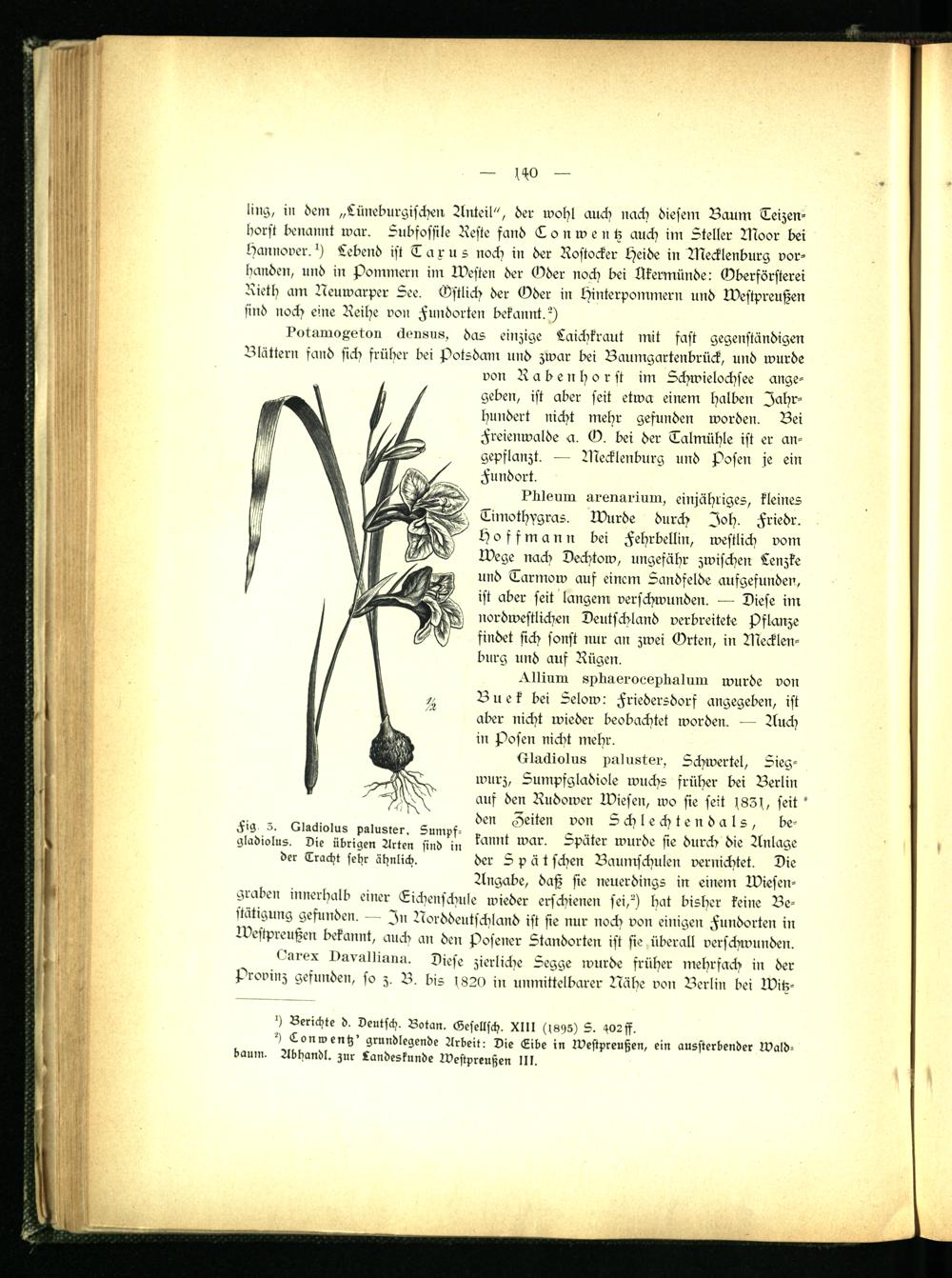Olnstivlus prrlnstor, Schwertel, Siegwurz, Sumpfgladiole wuchs früher bei Berlin auf den Rudower Wiesen, wo sie seit 1831, seit ' den Zeiten von S ch l e ch t e n d a l s, bekannt war. Später wurde sie durch die Anlage der Spätschen Baumschulen vernichtet. Die Angabe, daß sie neuerdings in einem Wiesengraben innerbalb einer Tichenschule wieder erschienen sei,') hat bisher keine Bestätigung gefunden. — ^n Aorddeutschland ist sie nur noch von einigen Hundorten in Westpreußen bekannt, aueb an den Posener Standorten ist sie überall verschwunden.