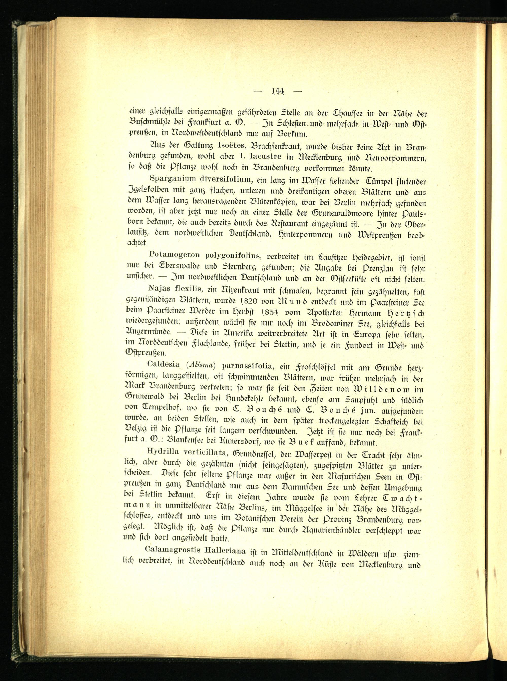 förmigen, langgestielten, oft schwimmenden Blättern, war früher mehrfach in der Mark Brandenburg vertreten; so war sie seit den Zeiten von Willdenow im Grunewald bei Berlin bei Hundekehle bekannt, ebenso am Saupfuhl und südlich von Tempelhof, wo sie von T. Bsuch6 und T. Bouchs jun. aufgefunden wurde, an beiden Stellen, wie auch in dem später trockengelegten Schafteich bei Belzig ist die Pflanze seit langem verschwunden. Jetzt ist sie nur noch bei Frankfurt a. O.: Blankensee bei Runersdorf, wo sie B u e k auffand, bekannt.