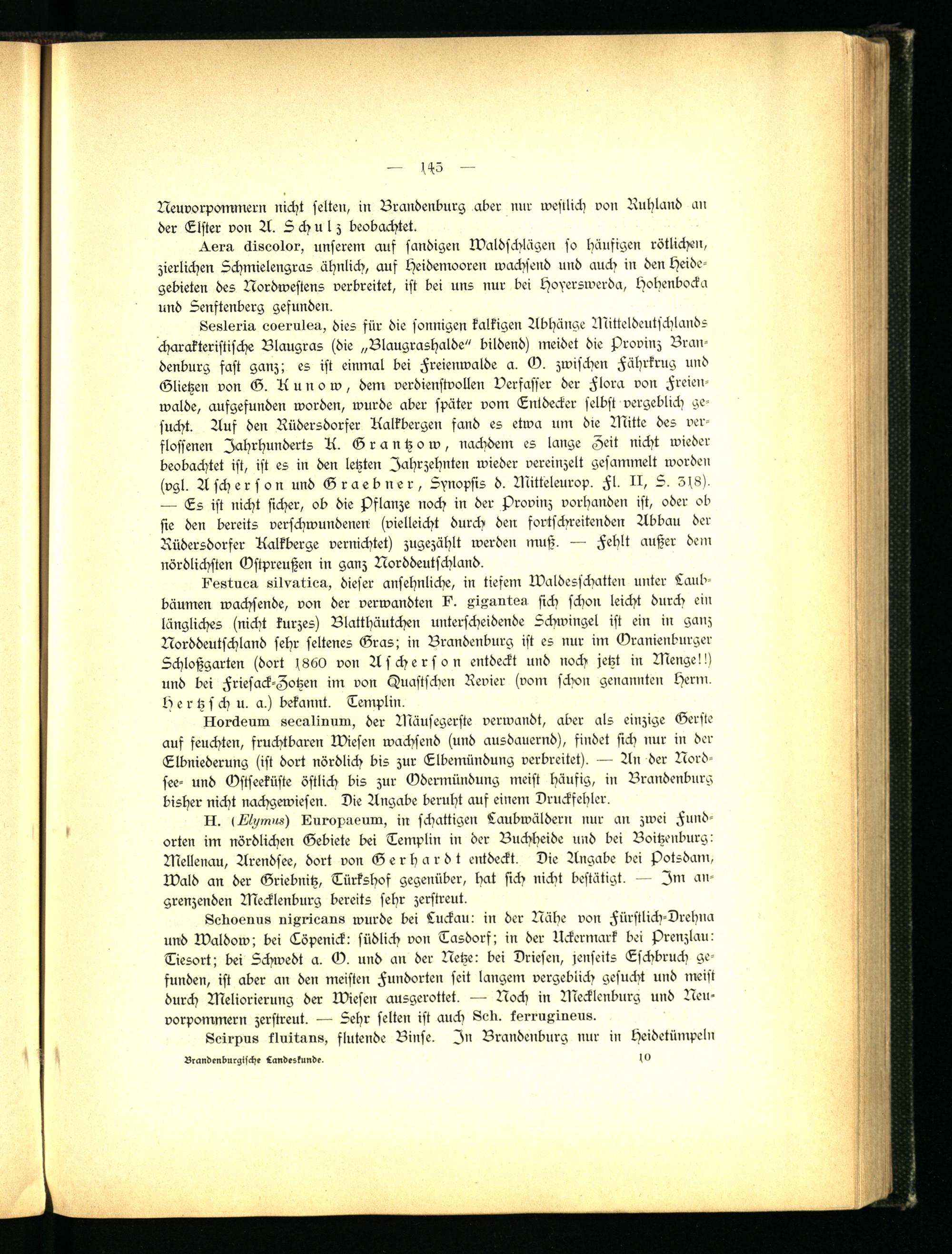 Lesloriu eoernlkn, dies für die sonnigen kalkigen Abhänge Mitteldeutschlands charakteristische Blaugras (die „Blaugrashalde" bildend) meidet die Provinz Brandenburg fast ganz; es ist einmal bei Freienwalde a. G. zwischen Führkrug und Glietzen von G. Kunow, dem verdienstvollen Verfasser der Flora von Freienwalde, aufgefunden worden, wurde aber später vom Entdecker selbst vergeblich gesucht. Auf den Rüdersdorfer Kalkbergen fand es etwa um die Mitte des verflossenen Jahrhunderts K. Grantzow, nachdem es lange Zeit nicht wieder beobachtet ist, ist es in den letzten Jahrzehnten wieder vereinzelt gesammelt worden (vgl. Ascherson und Graebner, Synopsis d. Mitteleurop. Fl. II, 5. Sf8). — Es ist nicht sicher, ob die Pflanze noch in der Provinz vorhanden ist, oder ob sie den bereits verschwundenen (vielleicht durch den fortschreitenden Abbau der Rüdersdorfer Kalkberge vernichtet) zugezählt werden muß. — Fehlt außer dem nördlichsten Gstpreußen in ganz Norddeutschland.