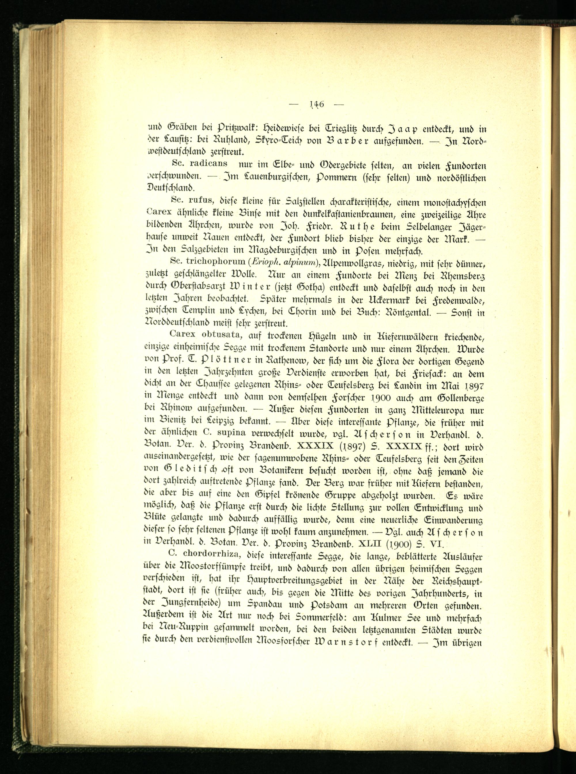 Lurex obtusutu, auf trockenen chügeln und in Kiefernwäldern kriechende, einzige einheimische Segge mit trockenem Standorte und nur einem Ährchen. Murde von Prof. T. plöttner in Rathenow, der sich um die Flora der dortigen Gegend in den letzten Jahrzehnten große Verdienste erworben hat, bei Friesack: an dem dicht an der Thaussee gelegenen Rhins- oder Teufelsberg bei Landin im Mai 189? in Menge entdeckt und dann von demselben Forscher 1900 auch am Gollenberge bei Rhinow aufgesunden. — Außer diesen Fundorten in ganz Mitteleuropa nur im Bienitz bei Leipzig bekannt. — Aber diese interessante Pflanze, die früher mit der ähnlichen 6. supluu verwechselt wurde, vgl. Ascherson in Verhandl. d. Botan. Ver. d. Provinz Brandenb. XXXIX (s89?) S. XXXIX ff. ; dort wird auseinandergesetzt, wie der sagenumwobene Rhins- oder Teufelsberg seit den Zeiten von Gleditsch.oft von Botanikern besucht worden ist, ohne daß jemand die dort zahlreich auftretende Pflanze fand. Der Berg war früher mit Kiefern bestanden, die aber bis auf eine den Gipfel krönende Gruppe abgeholzt wurden. Es wäre möglich, daß die Pflanze erst durch die lichte Stellung zur vollen Entwicklung und Blüte gelangte und dadurch auffällig wurde, denn eine neuerliche Einwanderung dieser so sehr seltenen Pflanze ist wohl kaum anzunehmen. — Vgl. auch Ascherson in Verhandl. d. Botan. Ver. d. Provinz Brandenb. XTII H900) 5. XI.