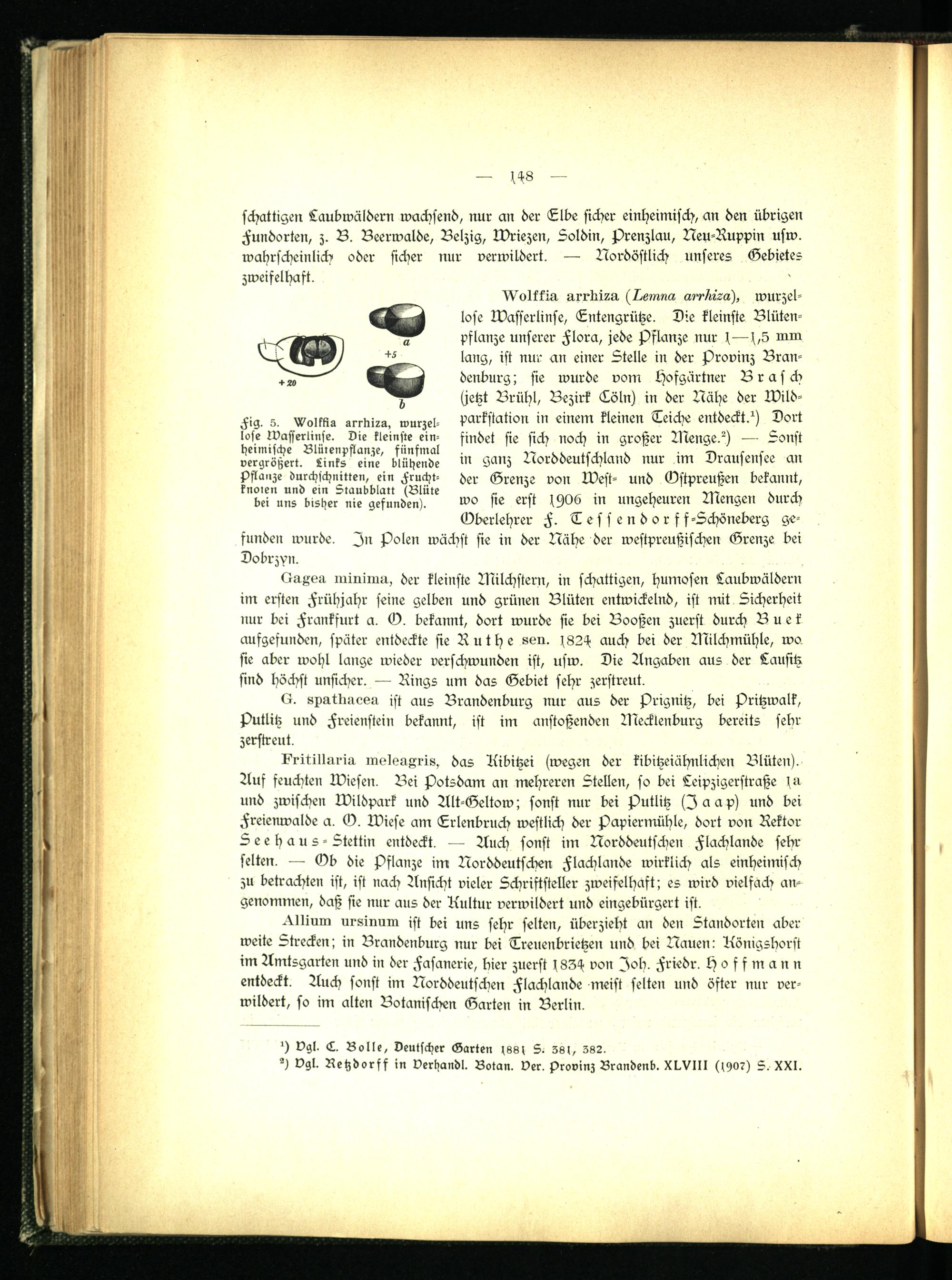 lose Wasserlinse, Entengrütze. Die kleinste Blütenpflanze unserer Flora, jede Pflanze nur f—1,5 mm lang, ist nur an einer Stelle in der Provinz Brandenburg; sie wurde vom Hofgärtner Brasch hetzt Brühl, Bezirk Eöln) in der Nähe der Wildparkstation in einem kleinen Teiche entdeckt?) Dort findet sie sich noch in großer Menge?) — Sonst in ganz Norddeutschland nur im Drausensee an der Grenze von West- und Ostpreußen bekannt, wo sie erst (906 in ungeheuren Mengen durch Oberlehrer F. Tessendorf f-Schöneberg gefunden wurde. In Polen wächst sie in der Nähe der westpreußischen Grenze bei Dobrzyn.