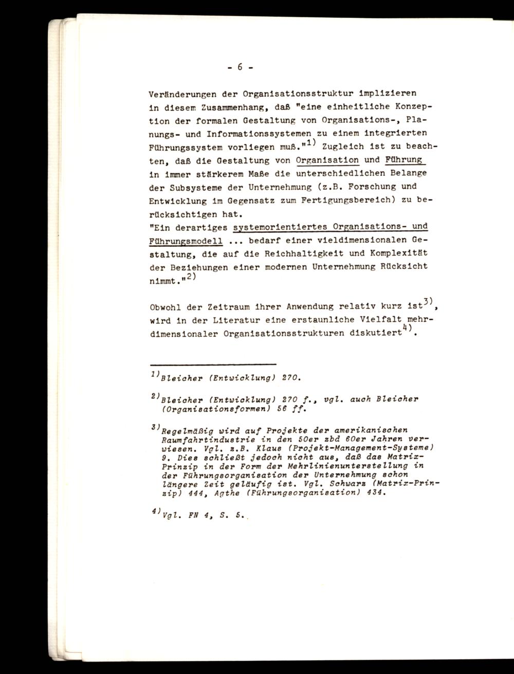 Raumfahrtindustrie in den 50er zbd 60er Jahren verwiesen. Vgl. z.B. Klaus(Projekt-Management-Systeme) 9. Dies schließt jedoch nicht aus, daß das MatrixPrinzip in der Form der Mehrlinienunterstellung in der Führungsorganisation der Unternehmung schon längere Zeit geläufig ist. Vgl. Schwarz(Matrirx-Prinzip) 444, Agthe(Führungsorganisation) 434,