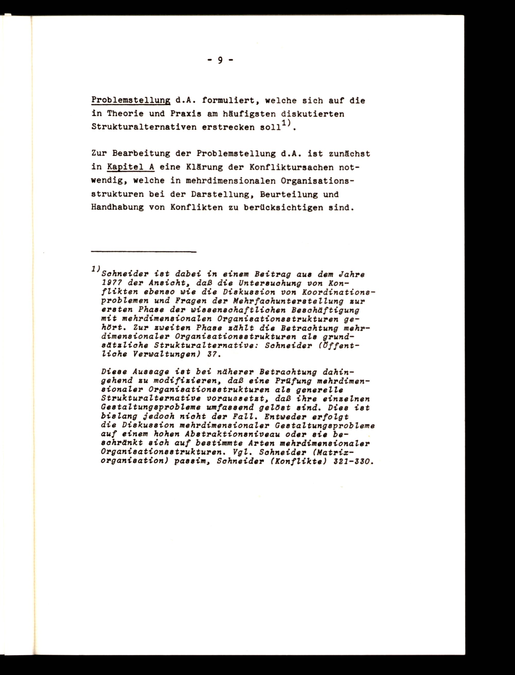 1977 der Ansicht, daß die Untersuchung von Konflikten ebenso wie die Diskussion von Koordinationsproblemen und Fragen der Mehrfachunterstellung zur ersten Phase der wissenschaftlichen Beschäftigung mit mehrdimensionalen Organisationsstrukturen gehört. Zur zweiten Phase zählt die Betrachtung mehrdimensionaler Organisationsstrukturen als grundsätzliche Strukturalternative: Schneider(Öffentliche Verwaltungen) 37.
