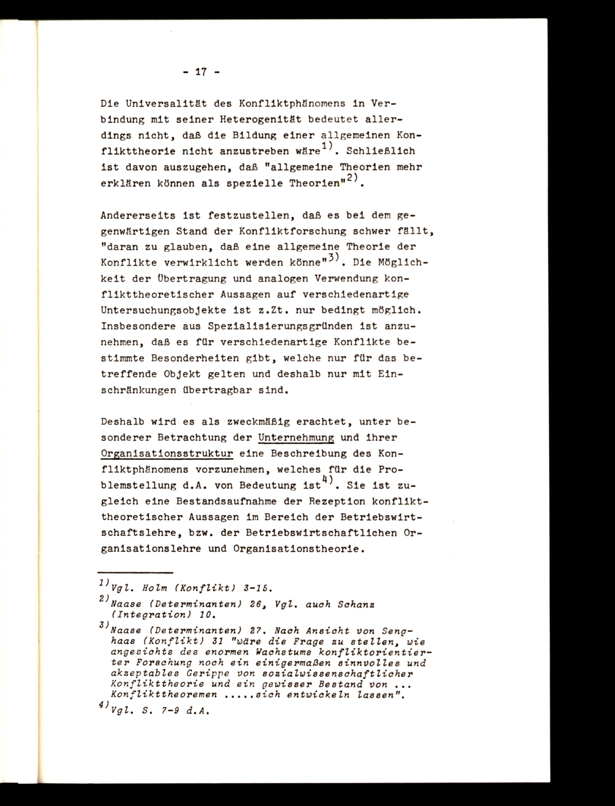 Deshalb wird es als zweckmäßig erachtet, unter besonderer Betrachtung der Unternehmung und ihrer Organisationsstruktur eine Beschreibung des Konfliktphänomens vorzunehmen, welches für die Problemstellung d.A. von Bedeutung 18), Sie ist zugleich eine Bestandsaufnahme der Rezeption konflikttheoretischer Aussagen im Bereich der Betriebswirtschaftslehre, bzw. der Betriebswirtschaftlichen Organisationslehre und Organisationstheorie.