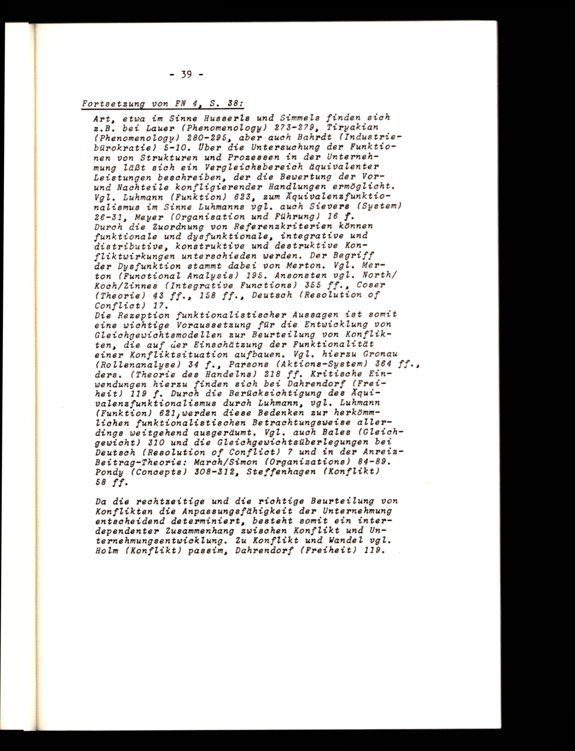 Art, etwa im Sinne Husserls und Simmels finden sich z.B. bei Lauer(Phenomenology) 273-279, Tiryakian (Phenomenologu) 280-295, aber auch Bahrdt(Industriebürokratie) 5-10. Über die Untersuchung der Funktionen von Strukturen und Prozessen in der Unternehmung läßt sich ein Vergleichsbereich äquivalenter Leistungen beschreiben, der die Bewertung der Vorund Nachteile konfligierender Handlungen ermöglicht, Vgl. Luhmann(Funktion) 623, zum Äquivalenzfunktionalismus im Sinne Luhmanns vgl. auch Sievers(System) 26-31, Meyer(Organisation und Führung) 16 f.