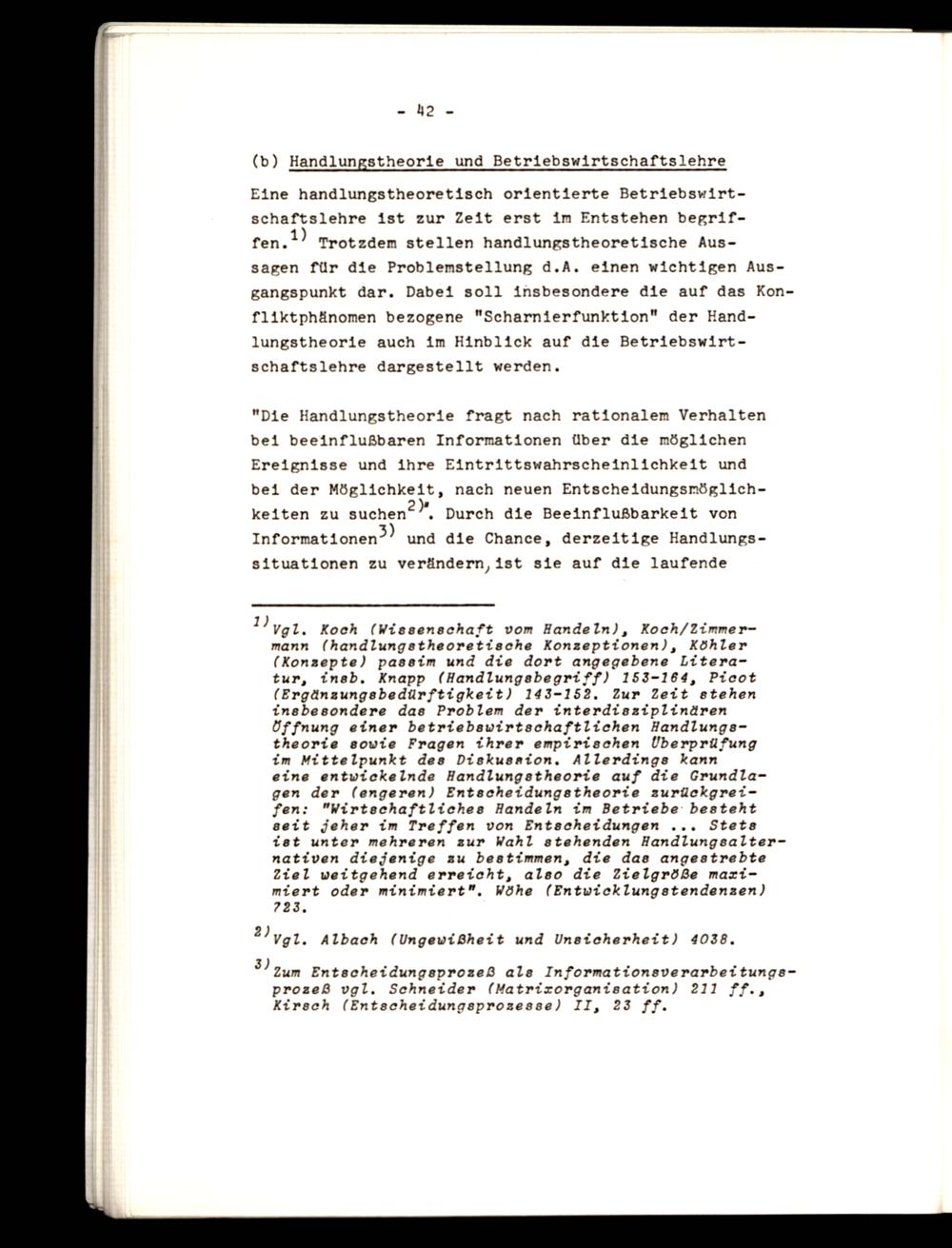 mann(handlungstheoretische Konzeptionen), Köhler (Konzepte) passim und die dort angegebene Literatur, insb. Knapp(Handlungsbegriff) 153-164, Picot (Ergänzungsbedürftigkeit) 143-152. Zur Zeit stehen insbesondere das Problem der interdisziplinären Öffnung einer betriebswirtschaftlichen Handlungstheorie 8owie Fragen ihrer empirischen Überprüfung im Mittelpunkt des Diskussion. Allerdings kann