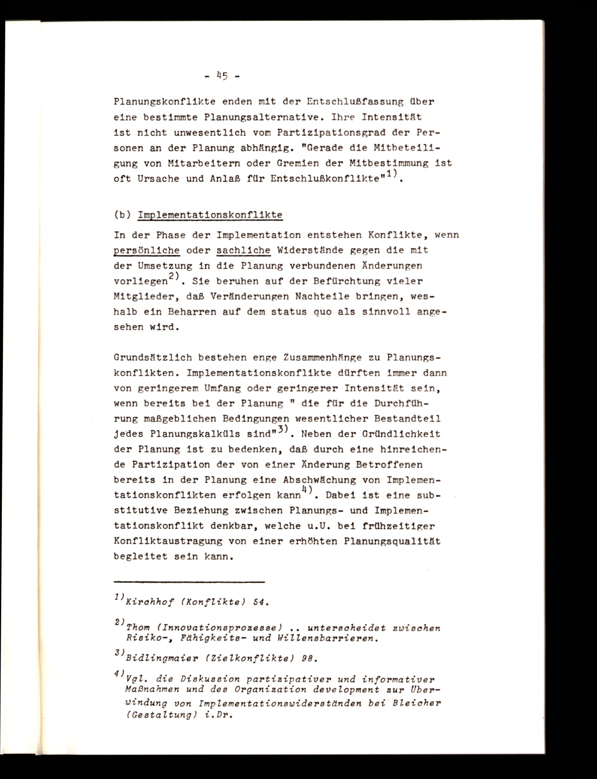 Grundsätzlich bestehen enge Zusammenhänge zu Planungskonflikten. Implementationskonflikte dürften immer dann von geringerem Umfang oder geringerer Intensität sein, wenn bereits bei der Planung" die für die Durchführung maßgeblichen Bedingungen wesentlicher Bestandteil jedes Planungskalküls sinar3), Neben der Gründlichkeit der Planung ist zu bedenken, daß durch eine hinreichende Partizipation der von einer Änderung Betroffenen bereits in der Planung eine Abschwächung von Implemen