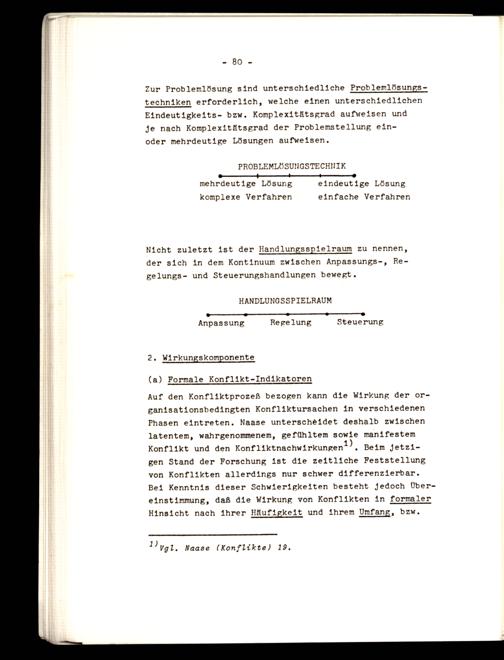 Auf den Konfliktprozeß bezogen kann die Wirkung der organisationsbedingten Konfliktursachen in verschiedenen Phasen eintreten. Naase unterscheidet deshalb zwischen latentem, wahrgenommenem, gefühltem sowie manifestem Konflikt und den Konfliktnachwirkungen?), Beim jetzigen Stand der Forschung ist die zeitliche Feststellung von Konflikten allerdings nur schwer differenzierbar. Bei Kenntnis dieser Schwierigkeiten besteht jedoch Übereinstimmung, daß die Wirkung von Konflikten in formaler Hinsicht nach ihrer Häufigkeit und ihrem Umfang, bzw.