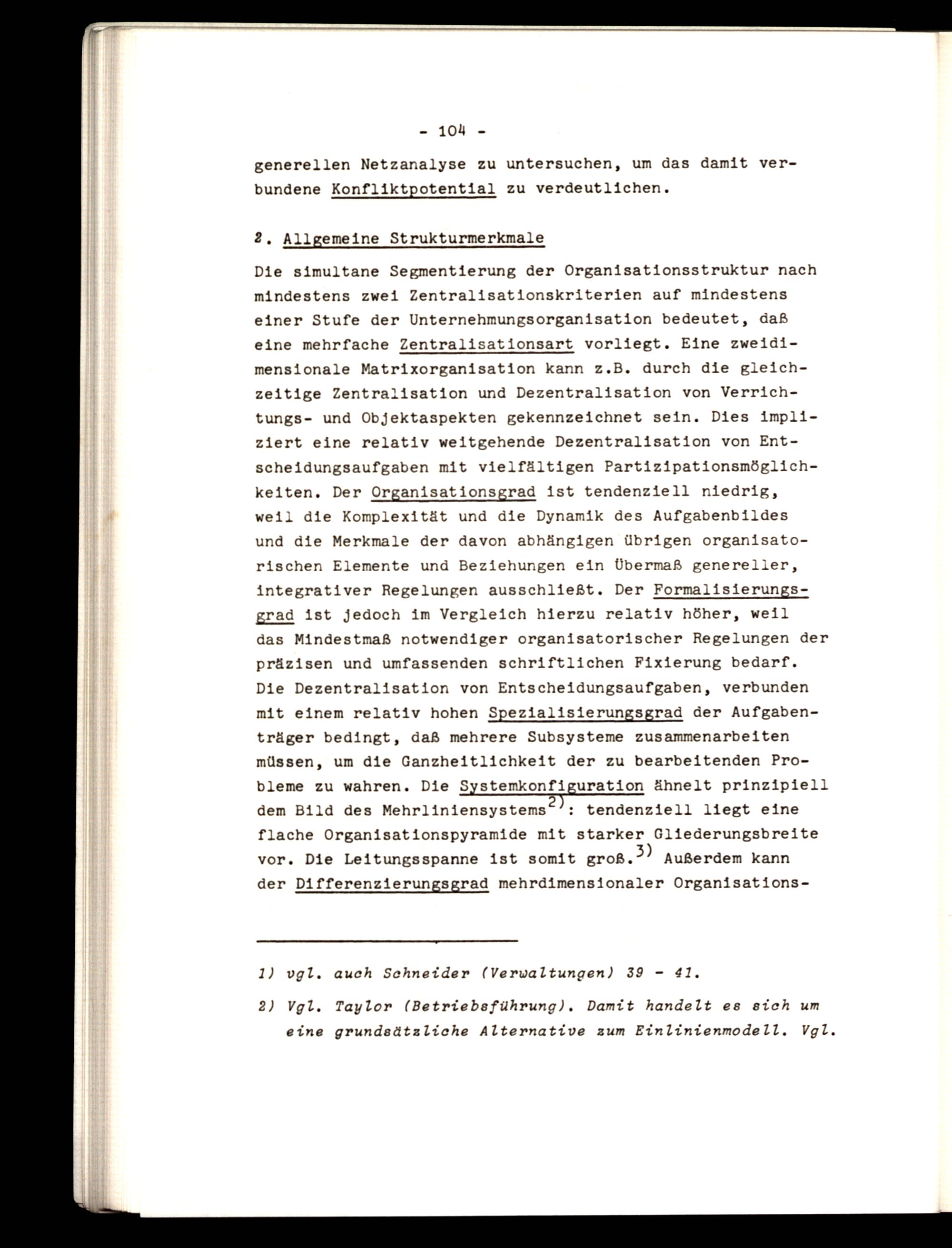 Die simultane Segmentierung der Organisationsstruktur nach mindestens zwei Zentralisationskriterien auf mindestens einer Stufe der Unternehmungsorganisation bedeutet, daß eine mehrfache Zentralisationsart vorliegt. Eine zweidimensionale Matrixorganisation kann z.B. durch die gleichzeitige Zentralisation und Dezentralisation von Verrichtungs- und Objektaspekten gekennzeichnet sein. Dies i1impliziert eine relativ weitgehende Dezentralisation von Entscheidungsaufgaben mit vielfältigen Partizipationsmöglichkeiten, Der Organisationsgrad ist tendenziell niedrig, weil die Komplexität und die Dynamik des Aufgabenbildes und die Merkmale der davon abhängigen übrigen organisatorischen Elemente und Beziehungen ein Übermaß genereller, integrativer Regelungen ausschließt. Der Formalisierungsgrad ist jedoch im Vergleich hierzu relativ höher, weil das Mindestmaß notwendiger organisatorischer Regelungen der präzisen und umfassenden schriftlichen Fixierung bedarf. Die Dezentralisation von Entscheidungsaufgaben, verbunden mit einem relativ hohen Spezialisierungsgrad der Aufgabenträger bedingt, daß mehrere Subsysteme zusammenarbeiten müssen, um die Ganzheitlichkeit der zu bearbeitenden Probleme zu wahren. Die Systemkonfiguration ähnelt prinzipiell dem Bild des Mehrliniensystems“‘: tendenziell liegt eine flache Organisationspyramide mit starker Gliederungsbreite vor. Die Leitungsspanne ist somit groß. 3) Außerdem kann der Differenzierungsgrad mehrdimensionaler Organisations