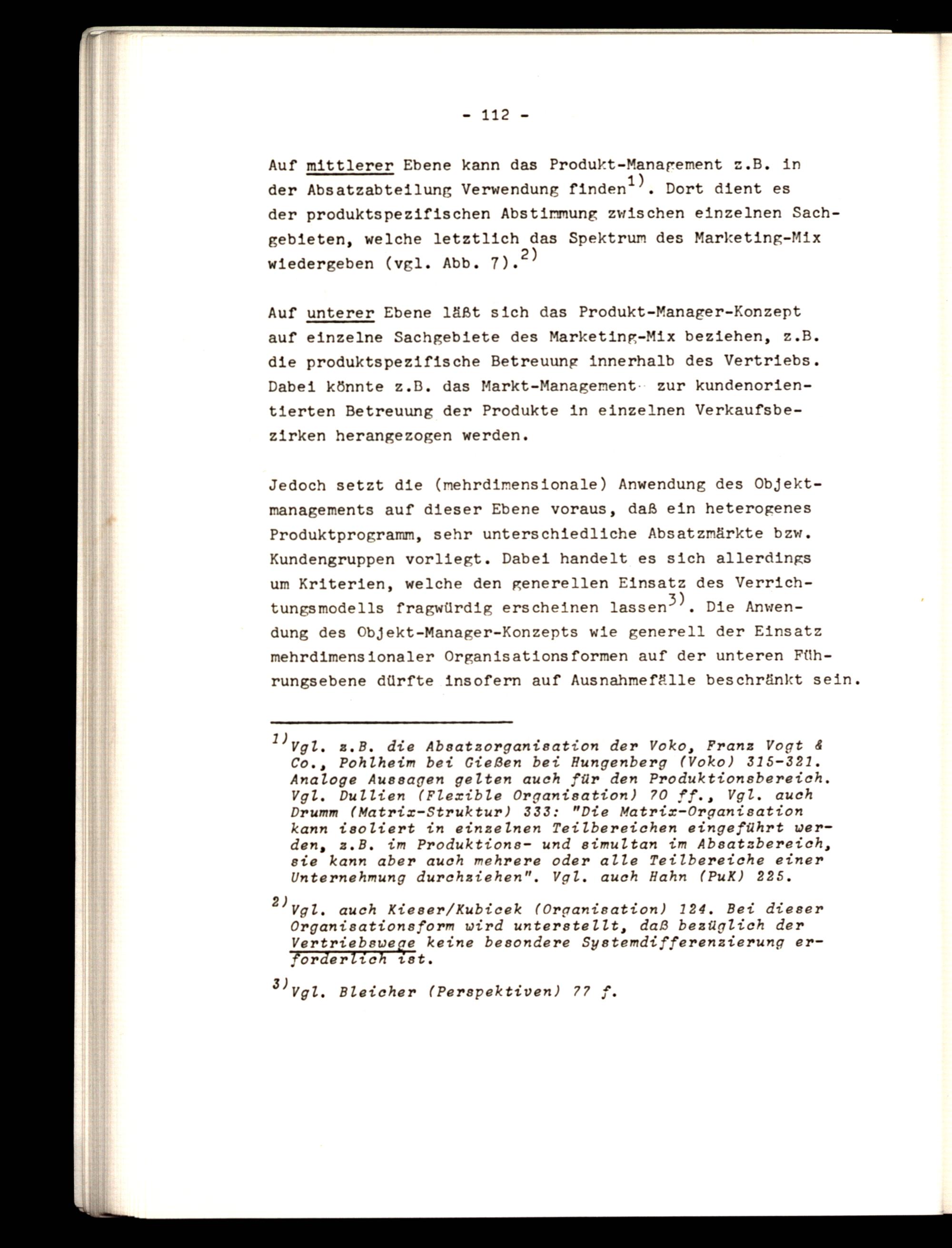 Co., Pohlheim bei Gießen bei Hungenberg(Voko) 315-321. Analoge Aussagen gelten auch für den Produktionsbereich, Vgl. Dullien(Flexible Organisation) 70 ff., Vgl. auch Drumm(Matrix-Struktur) 333:"Die Matrix-Organisation kann isoliert in einzelnen Teilbereichen eingeführt werden, z.B. im Produktions- und simultan im Absatzbereich, sie kann aber auch mehrere oder alle Teilbereiche einer Unternehmung durchziehen", Vgl. auch Hahn(PuK) 225,