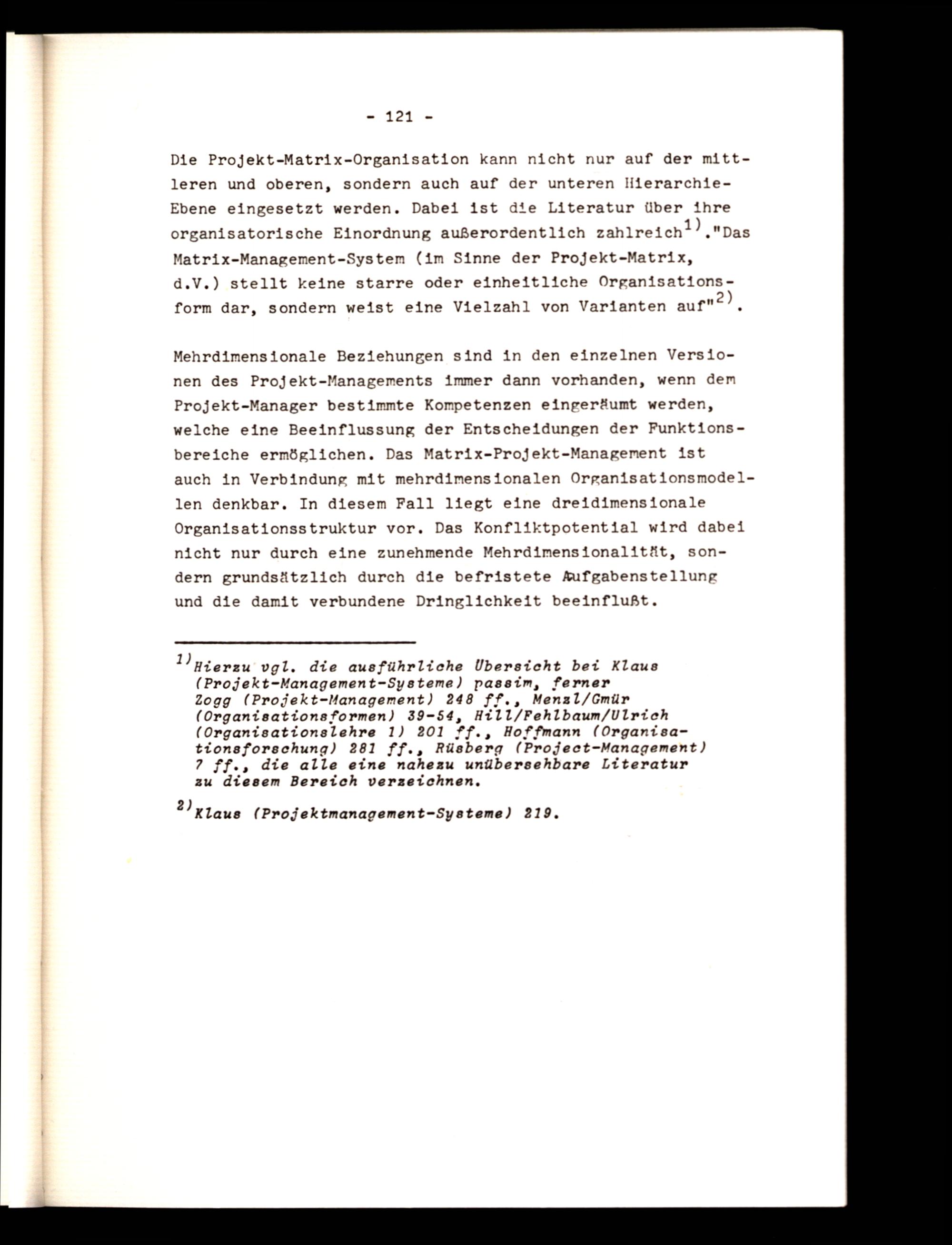 Z0ogg(Projekt-Management) 248 ff., Menzl/Gmür (Organisations formen) 39-54, Hill/Fehlbaum/Ulrich (Organisationslehre 1) 201 ff., Hoffmann(Organisationsforschung) 281 ff., Rüsberg(Project-Management) 7? ff.» die alle eine nahezu unübersehbare Literatur zu diesem Bereich verzeichnen,