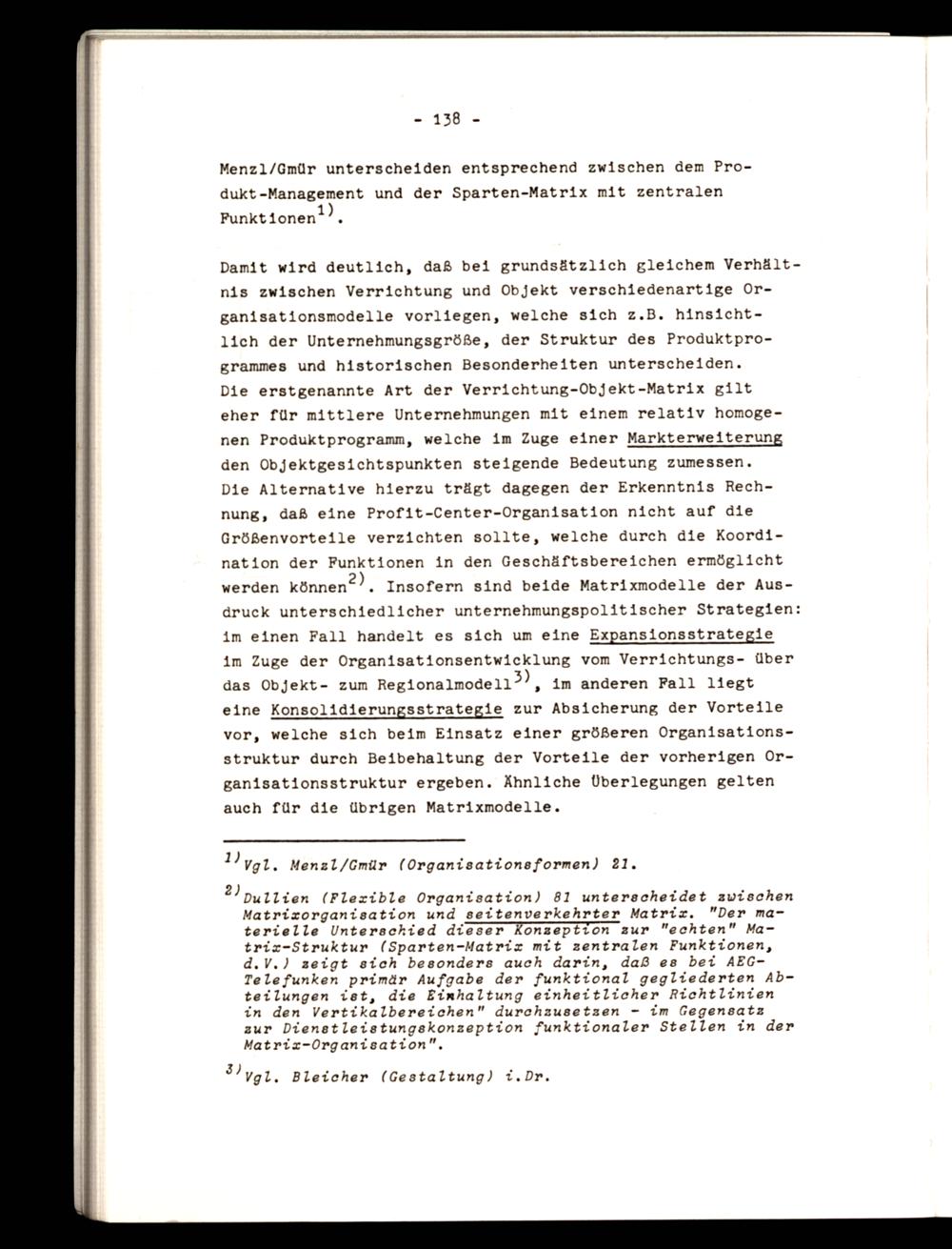 1yg1, Menzl/Gmür(Organisationsformen) 21. 2) pullien(Flexible Organisation) 81 unterscheidet zwischen Matrizorganisation und seitenverkehrter Matrix."Der materielle Unterschied dieser Konzeption zur"echten" Matrix-Struktur(Sparten-Matrix mit zentralen Funktionen, d.V.) zeigt sich besonders auch darin, daß es bei AEGTelefunken primär Aufgabe der funktional gegliederten Abteilungen ist, die Einhaltung einheitlicher Richtlinien in den Vertikalbereichen" durchzusetzen- im Gegensatz zur Dienstleistungskonzeption funktionaler Stellen in der Matrix-Organisation",