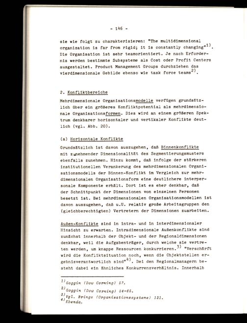 Außen-Konflikte sind in intra- und in interdimensionaler Hinsicht zu erwarten. Intradimensionale Außenkonflikte sind zunächst innerhalb der Objekt- und der Regionaldimensionen denkbar, weil die Aufgabenträger, durch welche sie vertreten werden, um knappe Ressourcen konkurrieren.})"Verschärft wird die Konfliktsituation noch, wenn die Cbjektstellen ergebnisverantwortlich sinar 1), Bei den Regionalmanagern besteht dabei ein ähnliches Konkurrenzverhältnis. Innerhalb
