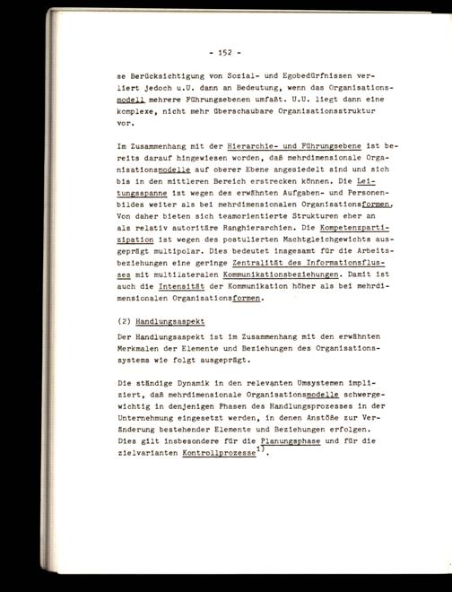 als relativ autoritäre Ranghierarchien. Die Kompetenzpartizipation ist wegen des postulierten Machtgleichgewichts ausgeprägt multipolar. Dies bedeutet insgesamt für die Arbeitsbeziehungen eine geringe Zentralität des_Informationsflusses mit multilateralen Kommunikationsbeziehungen. Damit ist auch die Intensität der Kommunikation höher als bei mehrdimensionalen Organisationsformen.