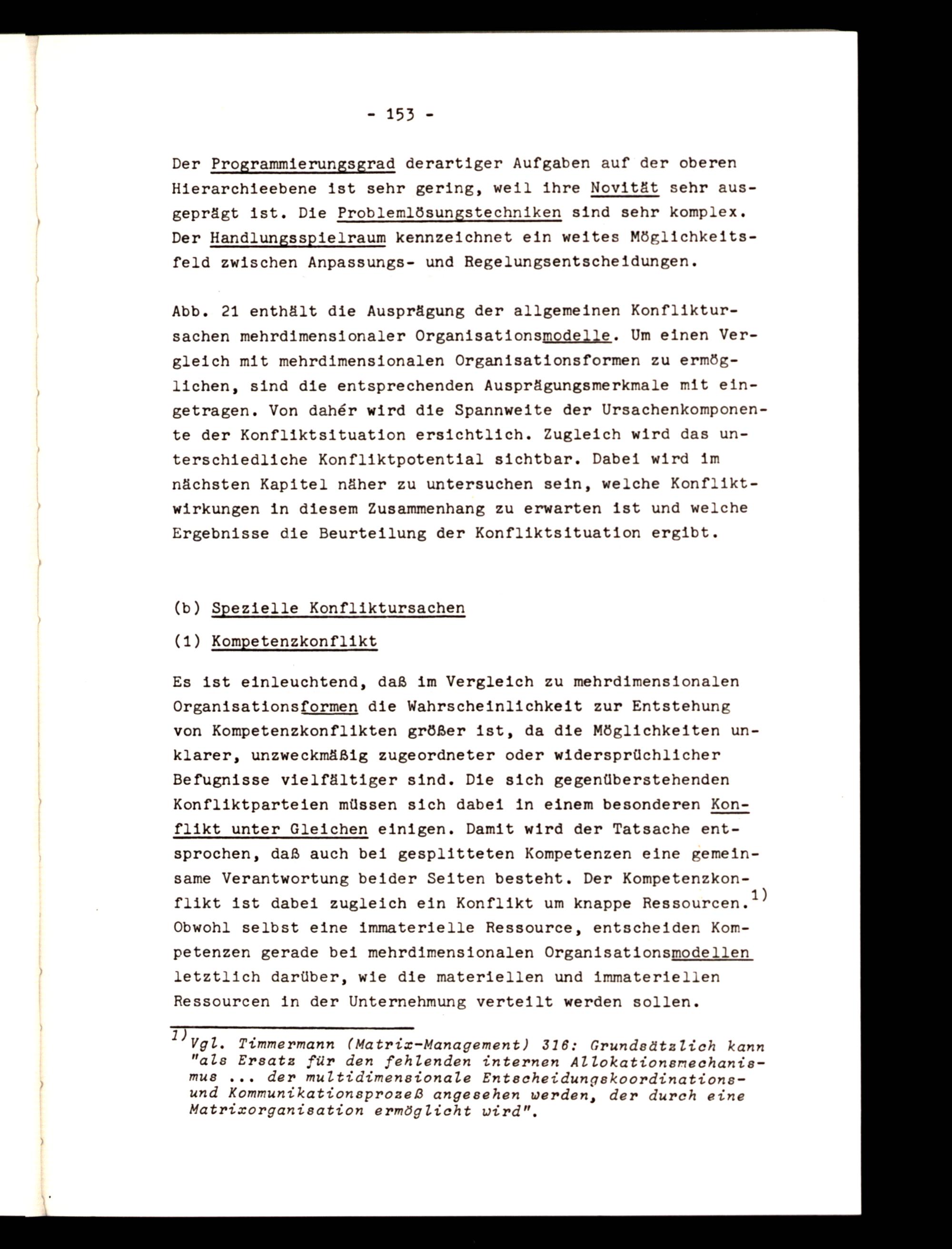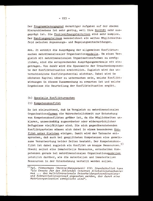 Es ist einleuchtend, daß im Vergleich zu mehrdimensionalen Organisationsformen die Wahrscheinlichkeit zur Entstehung von Kompetenzkonflikten größer ist, da die Möglichkeiten unklarer, unzweckmäßig zugeordneter oder widersprüchlicher Befugnisse vielfältiger sind. Die sich gegenüberstehenden Konfliktparteien müssen sich dabei in einem besonderen Konflikt_unter_Gleichen einigen. Damit wird der Tatsache entsprochen, daß auch bei gesplitteten Kompetenzen eine gemeinsame Verantwortung beider Seiten besteht. Der Kompetenzkonflikt ist dabei zugleich ein Konflikt um knappe Ressourcen. 1) Obwohl selbst eine immaterielle Ressource, entscheiden Kompetenzen gerade bei mehrdimensionalen Organisationsmodellen letztlich darüber, wie die materiellen und immateriellen Ressourcen in der Unternehmung verteilt werden sollen.