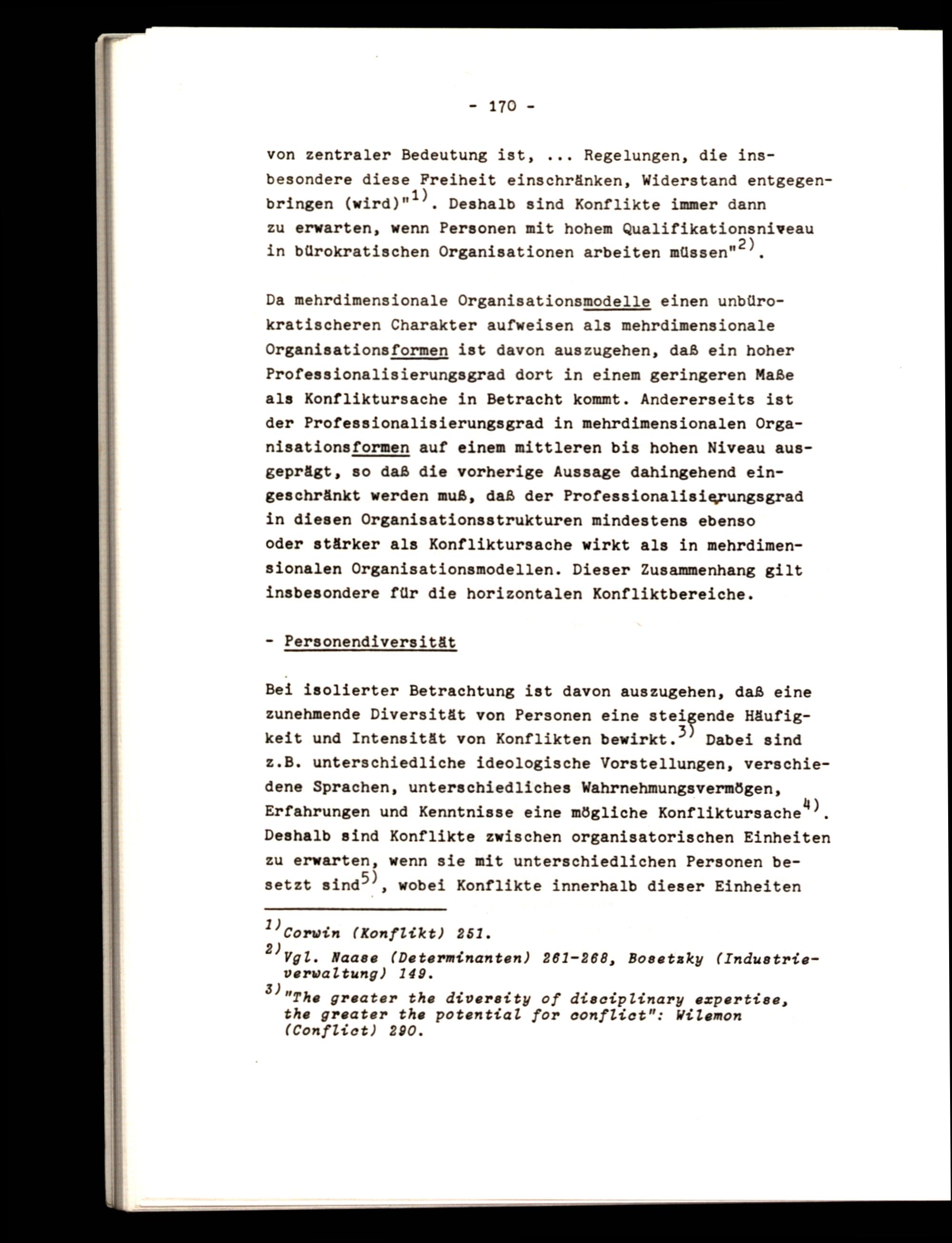 Bei isolierter Betrachtung ist davon auszugehen, daß eine zunehmende Diversität von Personen eine steigende Häufigkeit und Intensität von Konflikten bewirkt.” Dabei sind z.B. unterschiedliche ideologische Vorstellungen, verschiedene Sprachen, unterschiedliches Wahrnehmungsvermögen, Erfahrungen und Kenntnisse eine mögliche Konfliktursache”), Deshalb sind Konflikte zwischen organisatorischen Einheiten zu erwarten, wenn sie mit unterschiedlichen Personen besetzt sina?), wobei Konflikte innerhalb dieser Einheiten