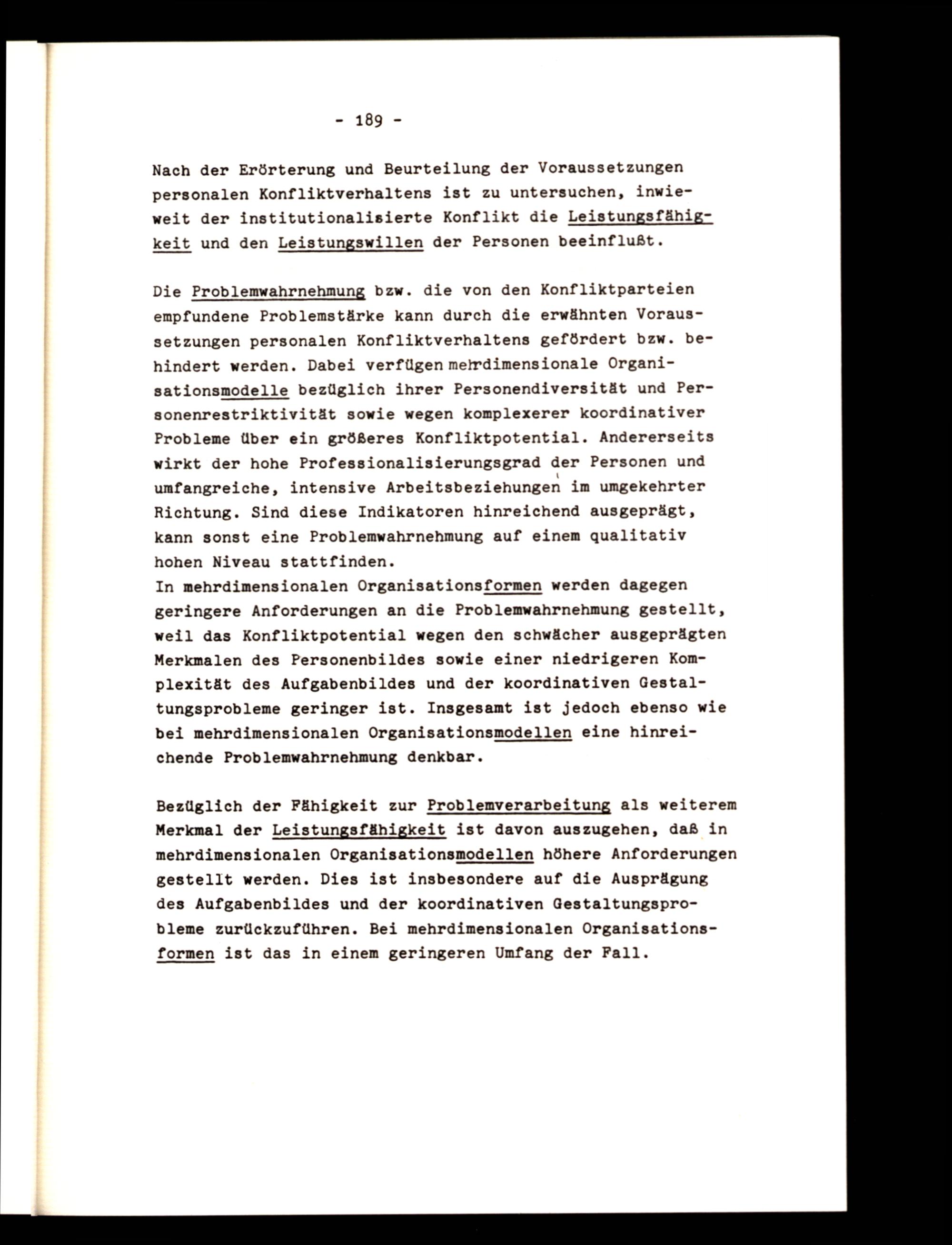 Die Problemwahrnehmung bzw. die von den Konfliktparteien empfundene Problemstärke kann durch die erwähnten Voraussetzungen personalen Konfliktverhaltens gefördert bzw. behindert werden. Dabei verfügen meirdimensionale Organisationsmodelle bezüglich ihrer Personendiversität und Personenrestriktivität sowie wegen komplexerer koordinativer Probleme über ein größeres Konfliktpotential. Andererseits wirkt der hohe Professionalisierungsgrad der Personen und umfangreiche, intensive Arbeitsbeziehungen im umgekehrter Richtung. Sind diese Indikatoren hinreichend ausgeprägt, kann sonst eine Problemwahrnehmung auf einem qualitativ hohen Niveau stattfinden.
