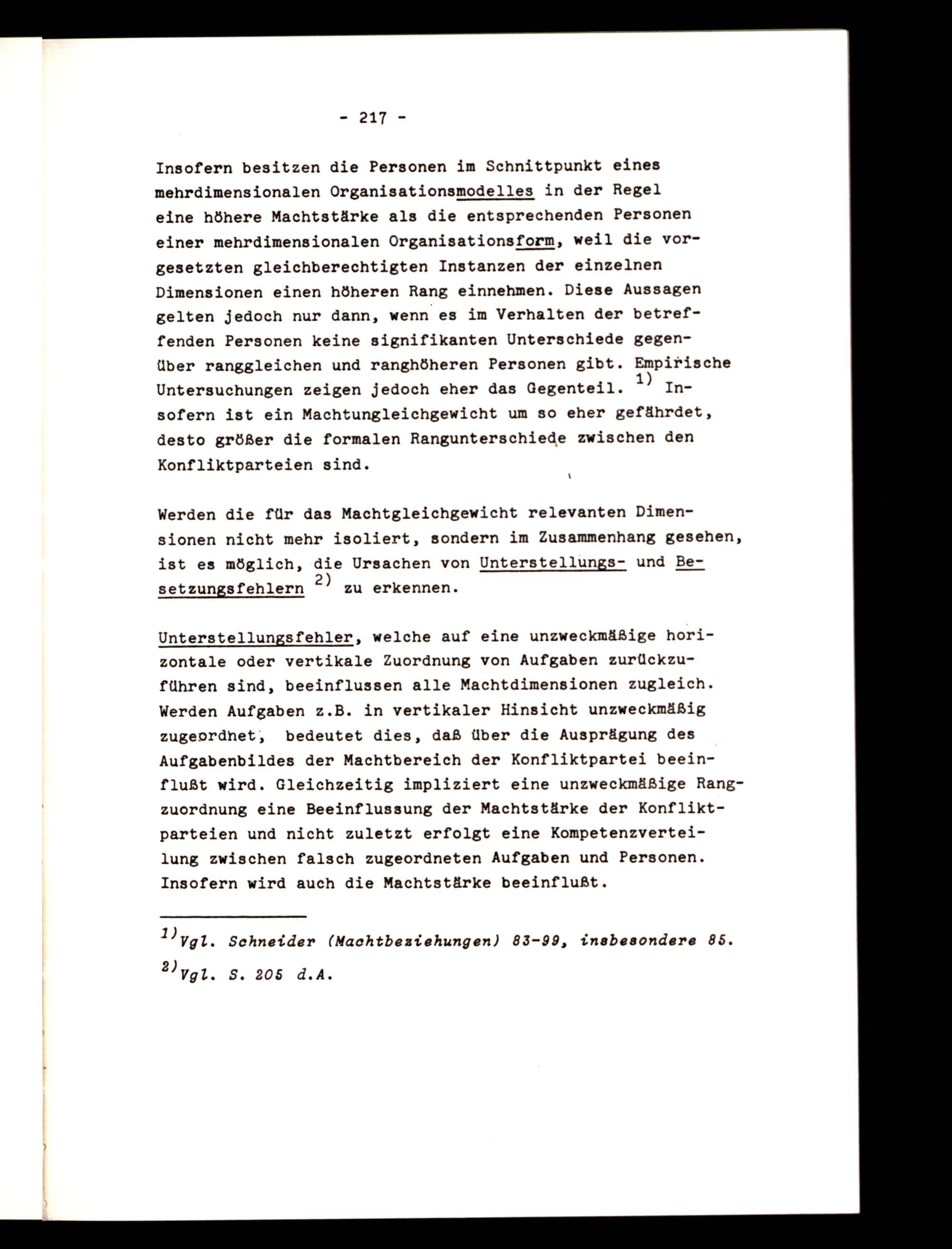 Unterstellungsfehler, welche auf eine unzweckmäßige horizontale oder vertikale Zuordnung von Aufgaben zurückzuführen sind, beeinflussen alle Machtdimensionen zugleich. Werden Aufgaben z.B. in vertikaler Hinsicht unzweckmäßig zugeordnet, bedeutet dies, daß über die Ausprägung des Aufgabenbildes der Machtbereich der Konfliktpartei beeinflußt wird. Gleichzeitig impliziert eine unzweckmäßige Rangzuordnung eine Beeinflussung der Machtstärke der Konfliktparteien und nicht zuletzt erfolgt eine Kompetenzverteilung zwischen falsch zugeordneten Aufgaben und Personen. Insofern wird auch die Machtstärke beeinflußt.