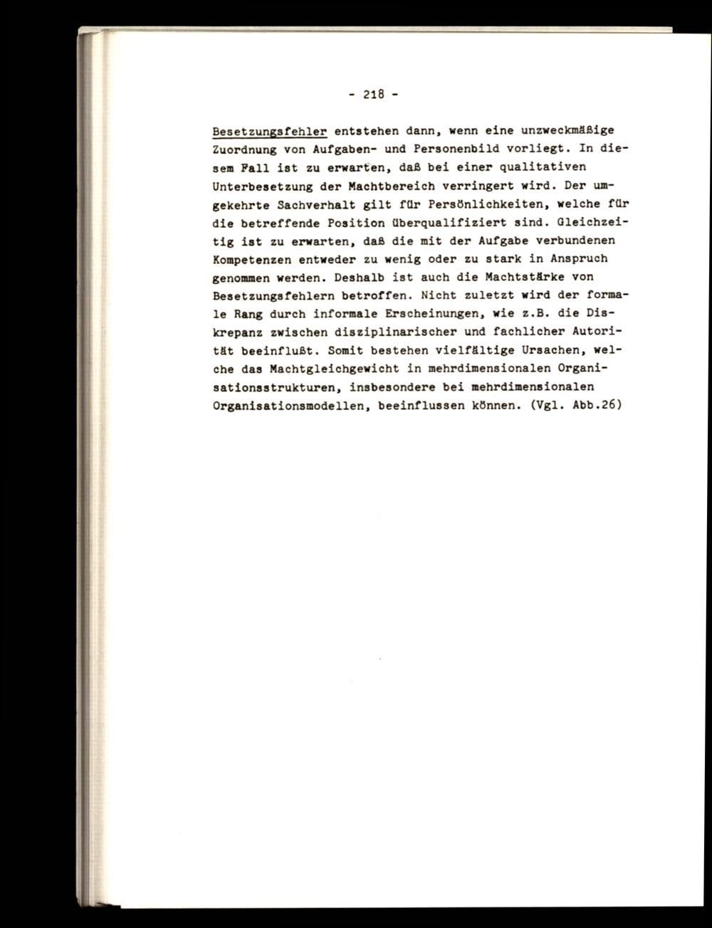 Zuordnung von Aufgaben- und Personenbild vorliegt. In diesem Fall ist zu erwarten, daß bei einer qualitativen Unterbesetzung der Machtbereich verringert wird. Der umgekehrte Sachverhalt gilt für Persönlichkeiten, welche für die betreffende Position überqualifiziert sind. Gleichzeitig ist zu erwarten, daß die mit der Aufgabe verbundenen Kompetenzen entweder zu wenig oder zu stark in Anspruch genommen werden. Deshalb ist auch die Machtstärke von Besetzungsfehlern betroffen. Nicht zuletzt wird der formale Rang durch informale Erscheinungen, wie z.B. die Diskrepanz zwischen disziplinarischer und fachlicher Autorität beeinflußt. Somit bestehen vielfältige Ursachen, welche das Machtgleichgewicht in mehrdimensionalen Organisationsstrukturen, insbesondere bei mehrdimensionalen Organisationsmodellen, beeinflussen können.(Vgl. Abb.26)